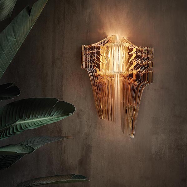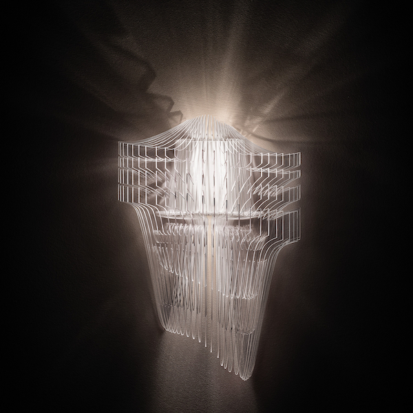 Zaha Hadid Design, led by Maha Kutay and Woody Yao, was in Milan this week where, among other product launches, unveiled Aria Applique, which is a new chandelier from Slamp that combines lighting technology with the studio’s seamless and futuristic architecture style. The light is fluid and dynamic. The electrical components are protected by an aesthetically balanced frame, creating three-dimensional volume. The 25 layer applique version is available in either a transparent or gold finish that casts refractions on the wall behind it.