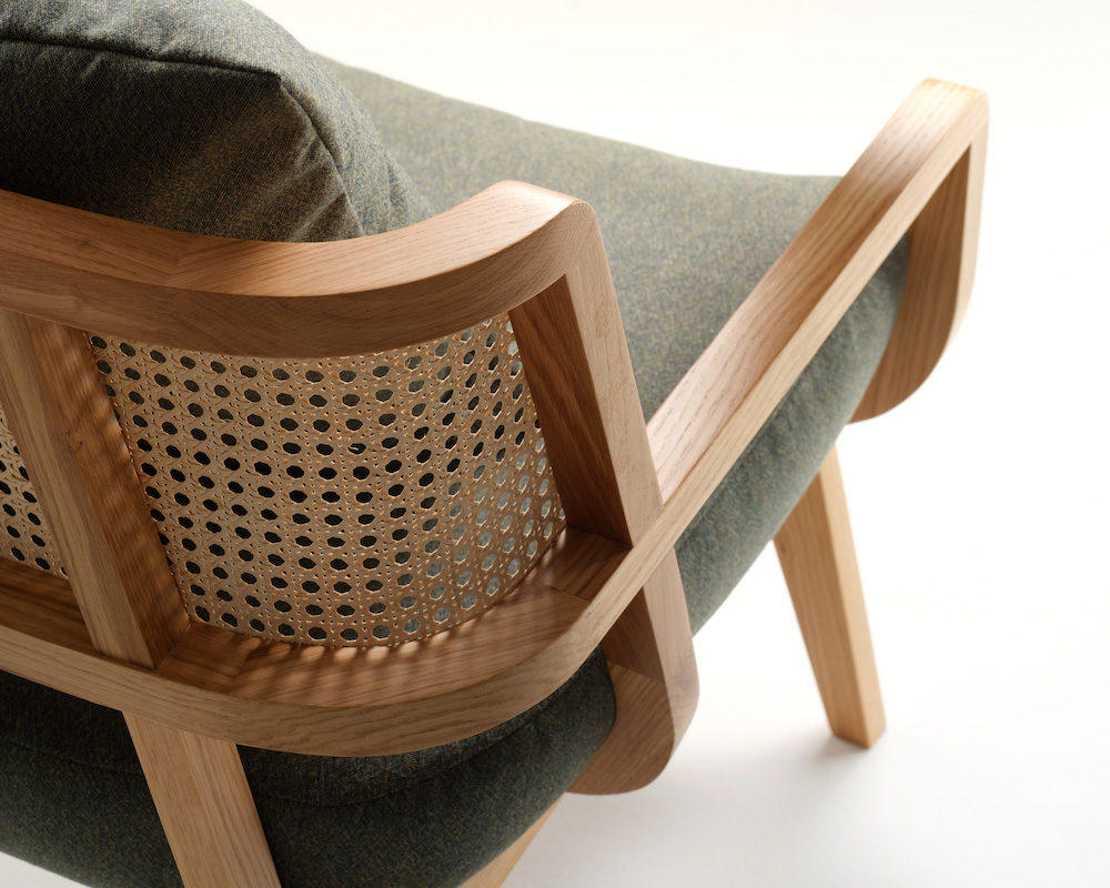 Comprising three lounge chairs and two dining chairs, the collection evokes an atmosphere of ‘komorebi’, the Japanese word for sunshine filtering through leaves, through an emphasis on space and light. Crafted timber frames create an airy aesthetic, complemented by a geometric back of small individual sections.