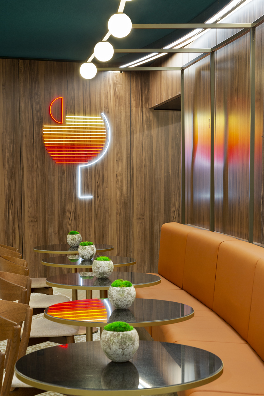 Spanning the eighth to the 32nd floors, each guestroom and suite offers a spectacular view over the city. Accessible via long corridors with retro-futurist lighting, make full use of their generous dimensions. Inside, the studio has achieved a weightless feeling of freedom and fluidity. The assemblage of bespoke furniture, using materials such as terrazzo and walnut veneers, paired with an earthy colour scheme brings the hotel up to date.