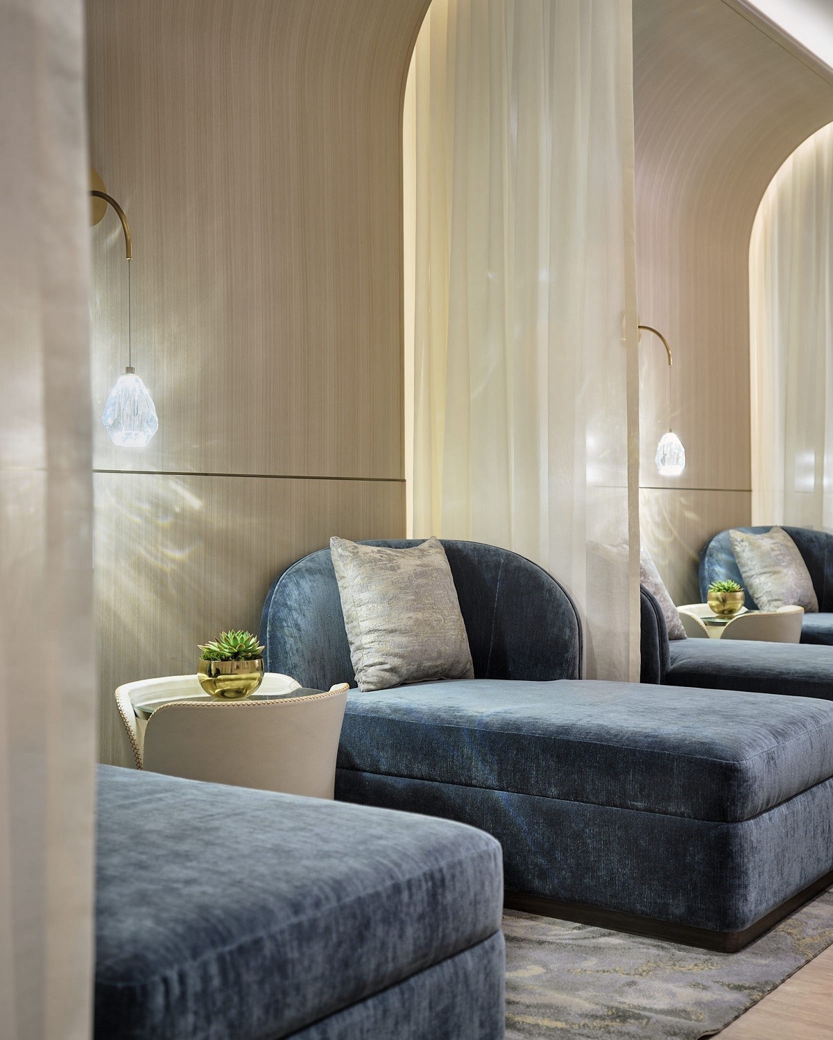 In the relaxation room, contemporary oversized loungers are separated by flowing ivory drapery, providing privacy yet filtered luminosity from the crystalline droplight sconces at each vignette. Wood flooring underfoot delivers the feeling of wellness from nature, while at the rear of the space, an abstract work by artist Amy Rader brings visual calmness. Banquette seating nestled within an alcove is an intimate space for bridal parties and private celebrations, where a sculptural wall installation organically flows above in a graceful exploration of pattern, form and materials.