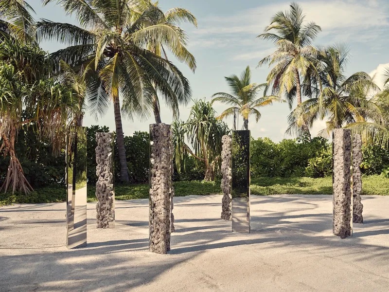 Further exclusive touches, which actually allow the resort to find its own authentic lane, are the large artworks that dot around the island. Guests are welcomed by a six-metre-wide textile by Hiroko Takeda, a New York based artist who was commissioned to express the colours and fragile ecology of the island setting. Whilst in a clearing amongst the palm trees, Netherlands-based Chinese artist Hongjie Yang has installed a series of eight-mirrored columns that have been designed to immerse viewers in reflections not only of themselves, but their natural surroundings.