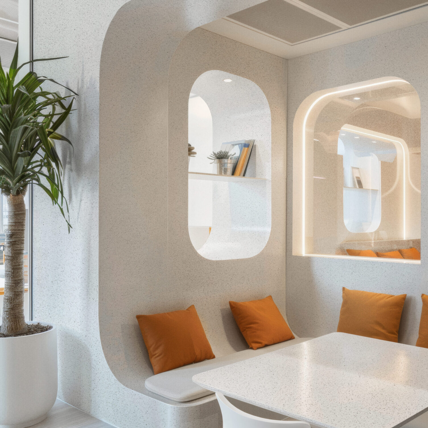 In high-traffic areas such as lobbies, restaurants, and recreational areas, design must not only impress, but also withstand the test of time and daily wear and tear. Corian meets this requirement, allowing for the creation of fluid, continuous surfaces that catch the eye while withstanding heavy use. Designers can play with organic shapes and elegant lines, while incorporating practical elements such as tables, counters, or wall cladding without visible joints