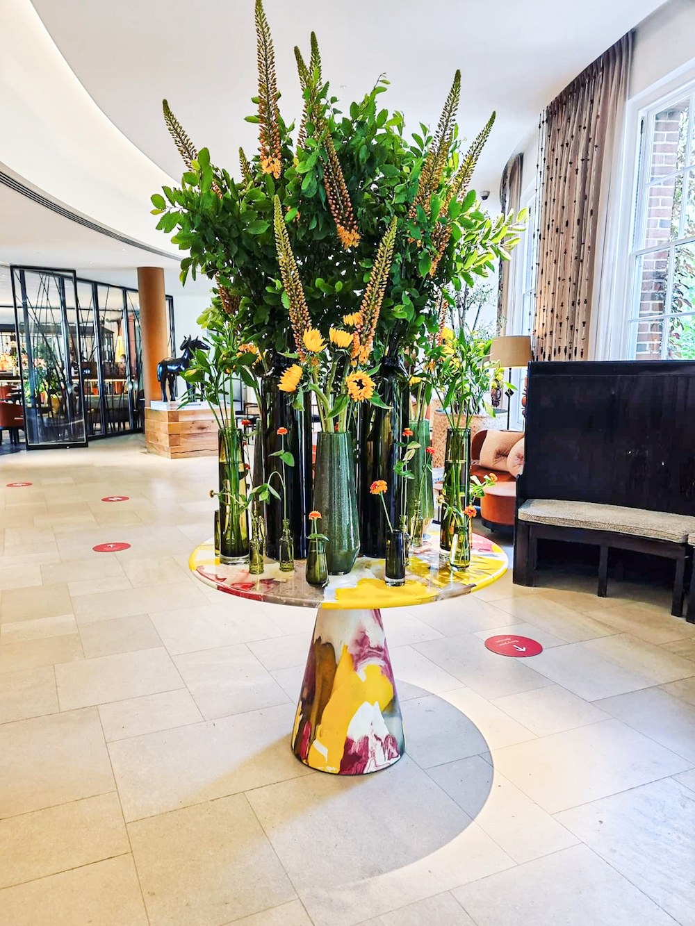 Upon entering The Grove, in what used to be a space that was fit for purpose, is now an inviting lobby that feels deeply considered from all angles. A colourful table catches my eye, which I am told has been made from recycled CDs. On its own it could be out of place, but on top of it is a wild floral display that creates a sort of harmony between nature, the heritage of the building and the contemporary flavour – all the while feeling timeless. Behind the check-in desk, a wall display of various keys of different sizes and styles is more than simply art outside the frame. It’s the result of Hulbert’s inability to let go of The Grove since he first started working on the hotel. “I actually collected all of those keys myself, over the years between the first renovation and this one, long before I was asked back to redesign the interiors,” he says. “I was collecting them to eventually be hung in that very space – I would have been somewhat disappointed, therefore, if they hadn’t asked me to return!” Overall, the lobby feels like a modern space; warm, inviting and complete with indoor trees, plants and playful details such as leathered-upholstered rocking chairs – a home-from-home, if that home was designed by a visionary designer!