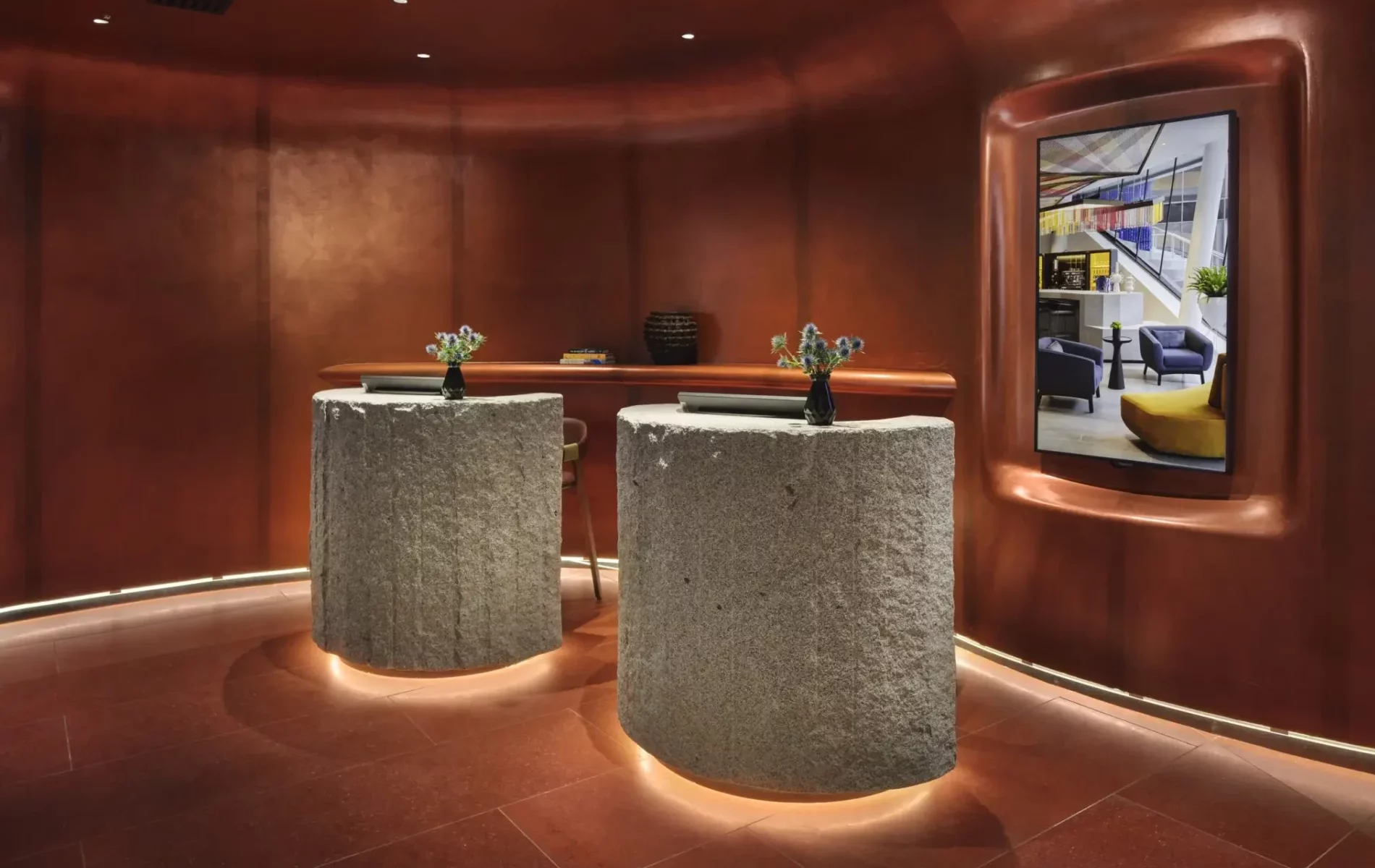 Edinburgh is built on a volcanic past and some of that geology came into our design, so there’s this enormous rock bar. We also looked to historical characters like the Picts — Scottish predecessors who used to paint their faces blue using a plant called woad. As for the hotel entrance, it’s a hero moment for us: a wall of unicorn heads. Why? Because the unicorn is the national symbol of Scotland. We also looked at the Loch Ness Monster (Nessie) and other mythical themes, but chose not to directly reference this.