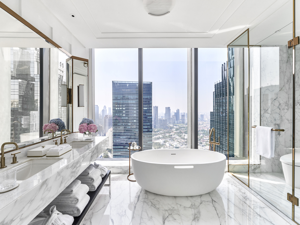 The Langham, Jakarta shelters 223 guestrooms with majestic floor-to-ceiling windows offering spectacular views of the city, state of the art in-room entertainment complemented by smart technology, opulent marble bathrooms featuring rain showers and free standing soaking bathtubs.