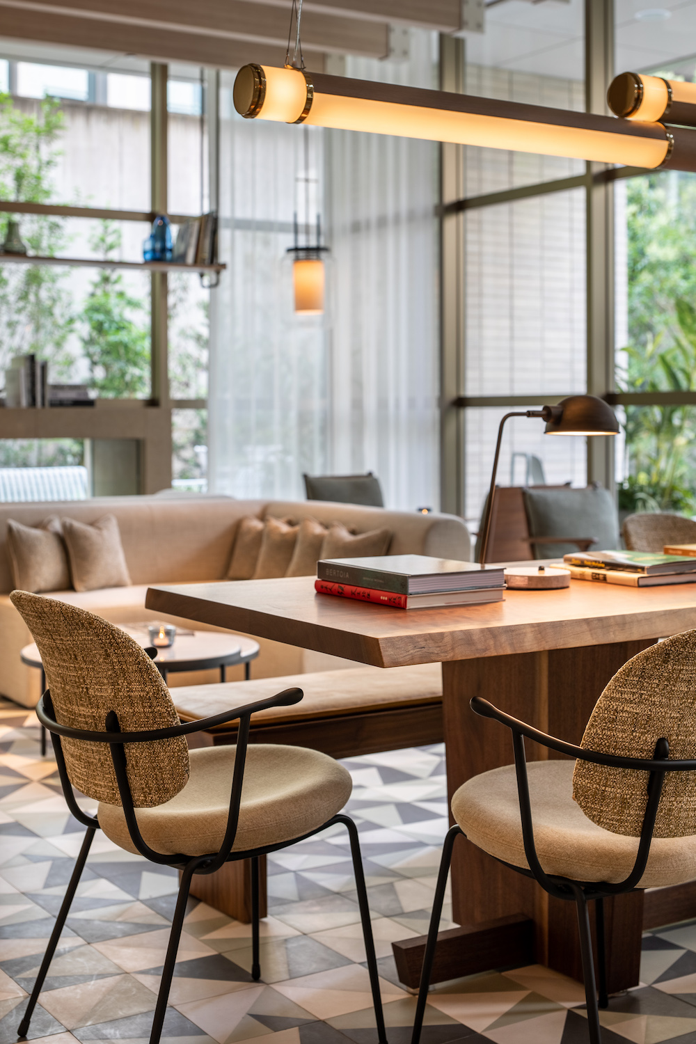 Tara Bernerd & Partners worked closely with the architects to anchor the building within the garden space, creating a seamless feel between inside and out. A glass-framed, double-sided fireplace in the lounge brings a focal point emphasising this connection. The lounge itself has a mixture of seating arrangements to suit different purposes and bring a home-from-home feel to the space. From cosy banquette seating with a hint of privacy, to the shared communal table and sofa groupings placed more centrally in the room, or close to the fireplace on the playful encaustic tiled floor. Sets of two chairs and a table have been placed near the window to capture as much of the greenery outdoors as possible and bring a connection to nature.