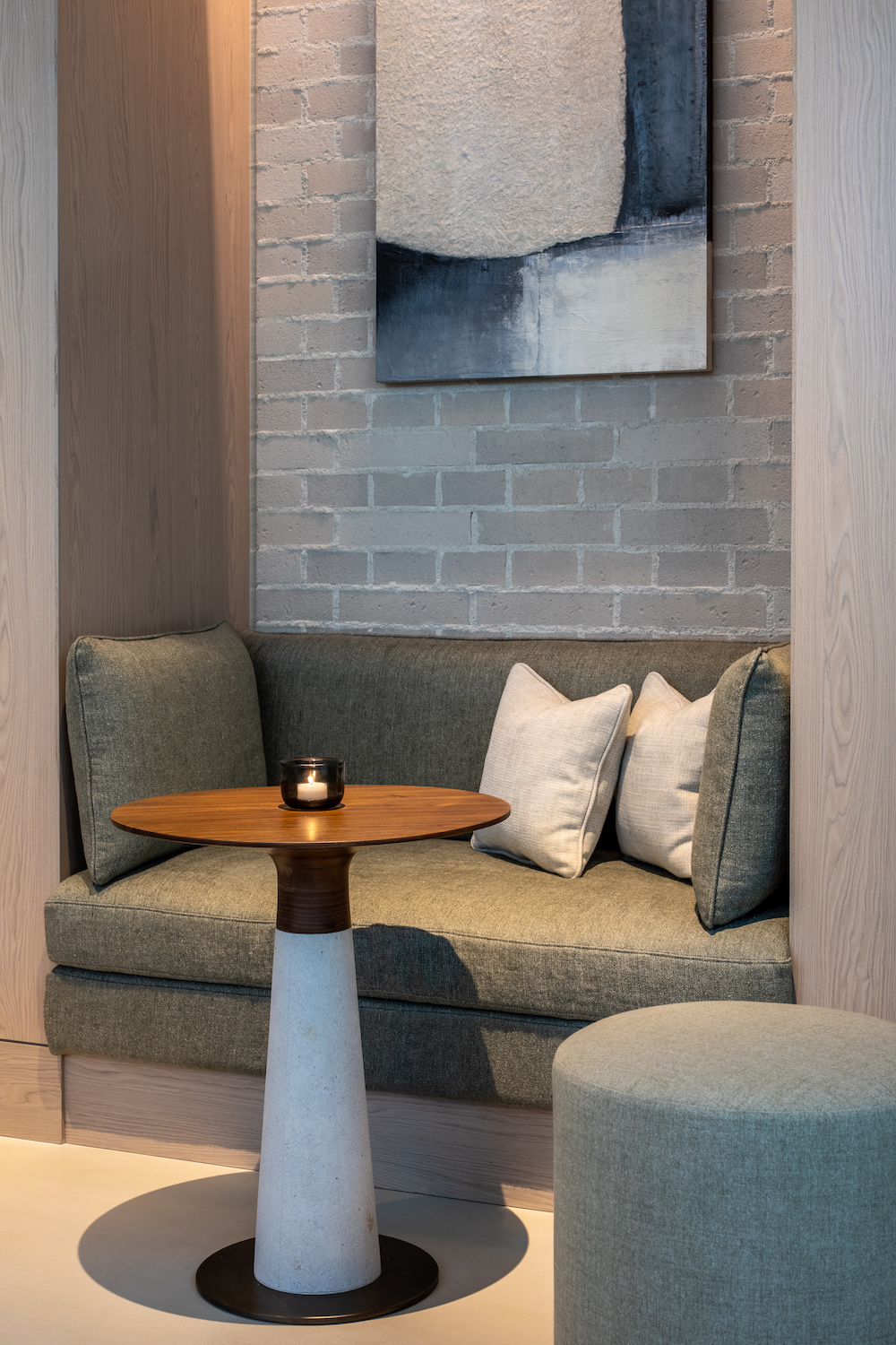 The lobby provides an open and casual welcome with an architecturally inspired stone staircase anchoring the space. Sculptural in style and materiality, the staircase is visible from street level and makes a distinctive impact on arrival. The contemporary yet laid-back feel continues throughout the ground floor, with the lounge providing an intimate escape in the heart of the city.