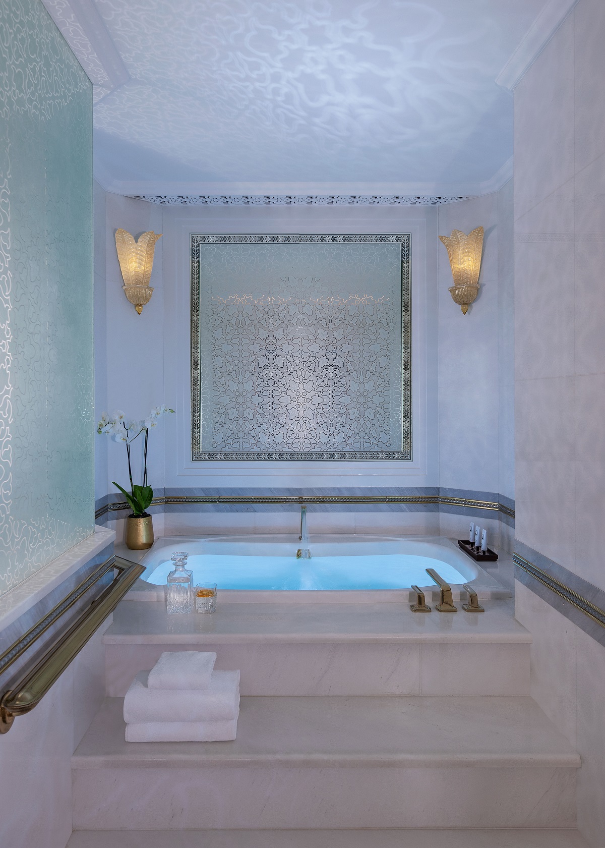 Upon entering the lobby, guests are welcomed by ornate marble and gilded ceilings paired with new contemporary furnishings and finishes. Along the corridors, bright wall trim and inset wallcoverings are contrasted against dark stone door drops and custom carpet patterns inspired by raked sand, which pick up the tonality of the various existing marble colourations to blend in with the grand corridor atriums. Door signage is designed with layered cut-outs based on Arabic geometric patterns, backlit for added glow and ambiance as you move through the corridors.
