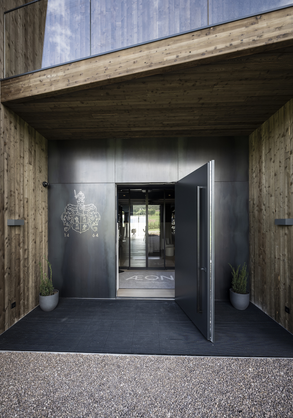 Guests enter the building through an entrance portal made of black steel, which bears the family’s old coat of arms from 1464 on the outside. “The ‘slope’ is traditionally an element for load transfer and static reinforcement – here it was used to make the volume more dynamic and to make it merge with the landscape,” adds Rottensteiner.