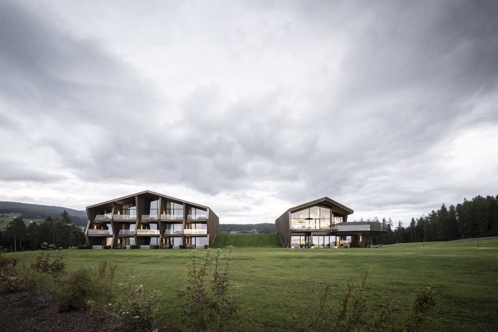 From the very beginning, the 550-year-old farm was a source of inspiration for the development process of the project, with special consideration given to the views and vistas of the site. A gentle nod was made to its past through the layout of the building units and the details, with the new buildings being consciously modelled on the existing structure. “The creation of an ambivalent tension between the centuries-old tradition of the rural complex and an exclusively modern statement was the basic principle underlying the design process,” explains Christian Rottensteiner, architect at noa*. “It would have been easy to simply go wild and focus on the famous ‘green meadow’. But we chose a different path: the design consists of freestanding structures that allow the landscape to flow through and become part of it. The result is two buildings, one hosting the public area with a reception, bistro, bar, and wellness area, while the other includes private areas with a total of 15 guest suites.”