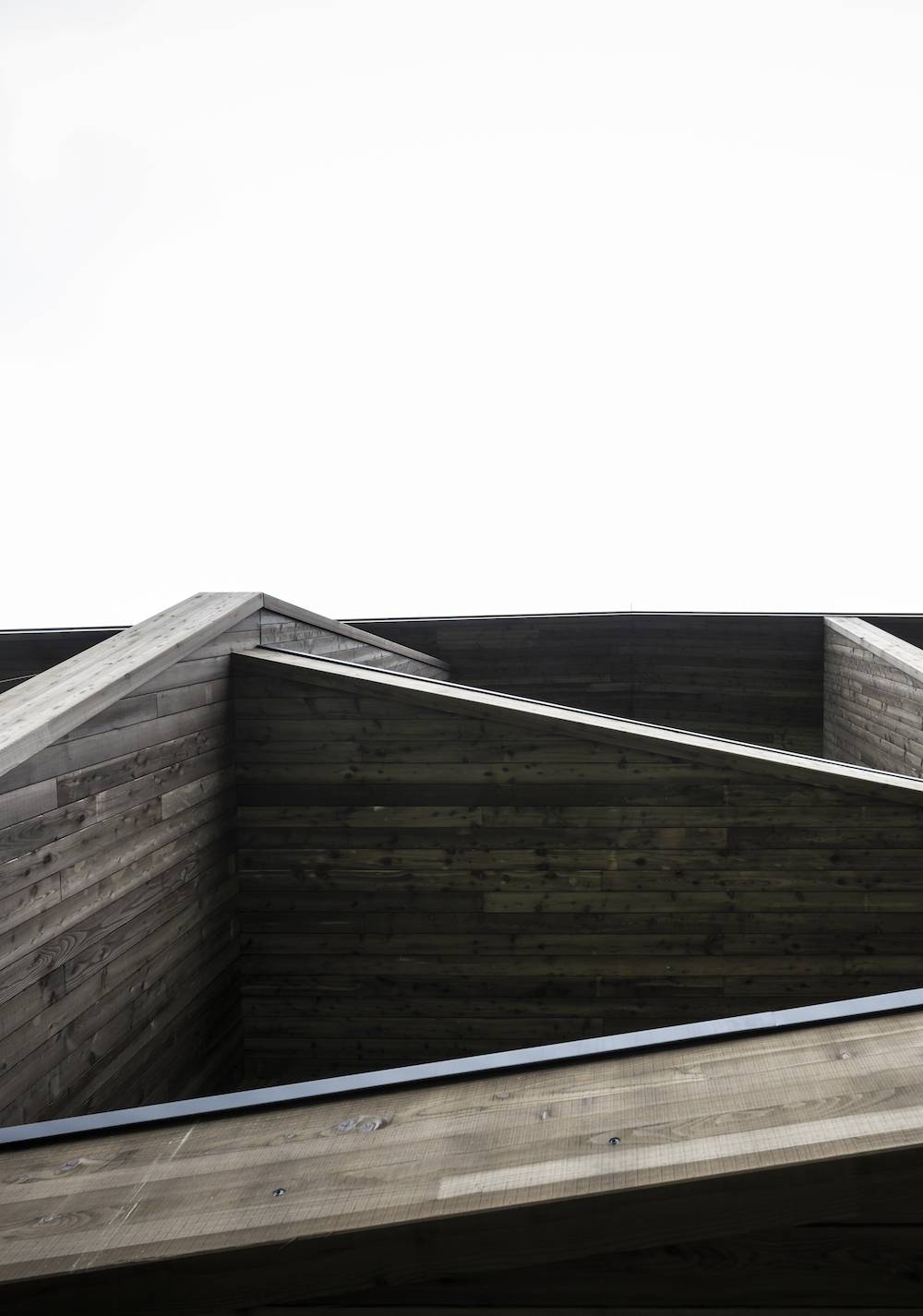 The two buildings that form the wellness hotel also relate directly with the existing structures in their design language. The use of traditional gable roofs, for example, as well as a very dynamic façade design with reinforcing slanted elements, replicate the design of the struts and brackets of the historically listed barn while translating them into a modern statement. This allows the facades to be perceived differently – depending on how one approaches the project. On one side, the east and west façades break strongly towards the outside, while in contrast, the north and south sides appear as a homogeneous envelope. The trapezoid windows are designed to catch the eye in a striking way, while the upper, slatted structure that stretches over the entire length of the building almost disguises the stories and create a homogeneous appearance.