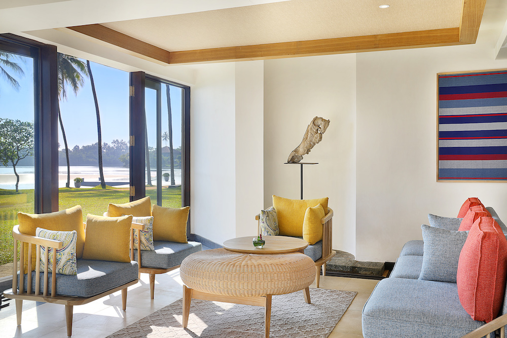 Originally designed in 1994 by Geoffrey Bawa, one of Sri Lanka’s most significant architects, in collaboration with furniture designer Rico Taravella, the vision of the entire Resort was to define a spacious amphitheatre which is achieved through a triton-like layout, as the accommodation wings expand off at angles from the centre. The 105-key resort sits where the Kalu Ganga (River) diverges into a lagoon and the Indian Ocean. The surrounding scenery amplifies the new look of the Resort, which stays true to the tropical modern aesthetic while refreshing the property with crisp, bright touches.