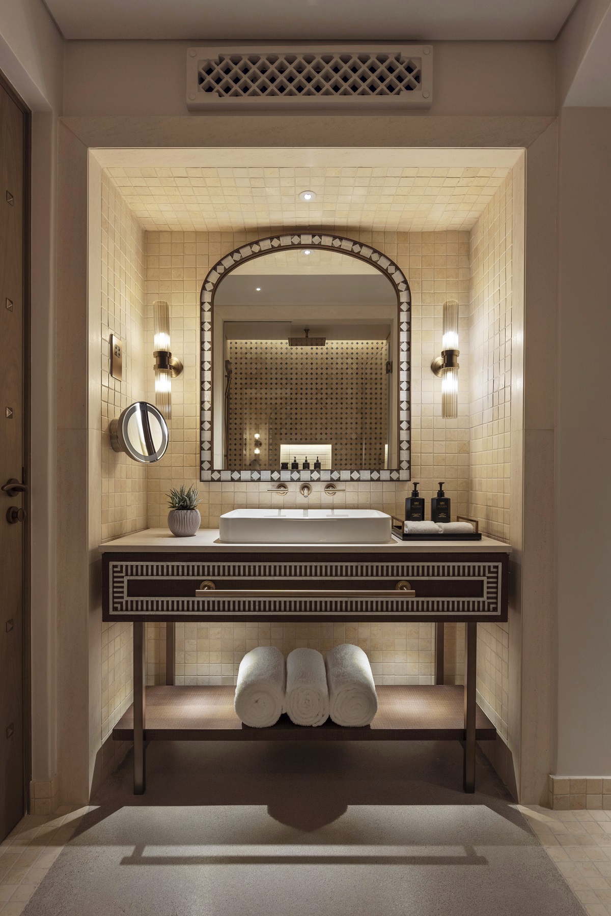 The five signature suites are a true ode to Arabian glamour. A rich colour palette of burgundy and teal immediately lifts the design. The living area is a luxurious depiction of a bygone decadent time with beautiful handcrafted furniture pieces detailed with rope and tassels. Sliding metal-studded doors reveal the bedroom, a floor-to-ceiling cabinet-style mini bar with an internal pop of colour, a walk-in wardrobe, a double vanity and a free-standing bathtub.