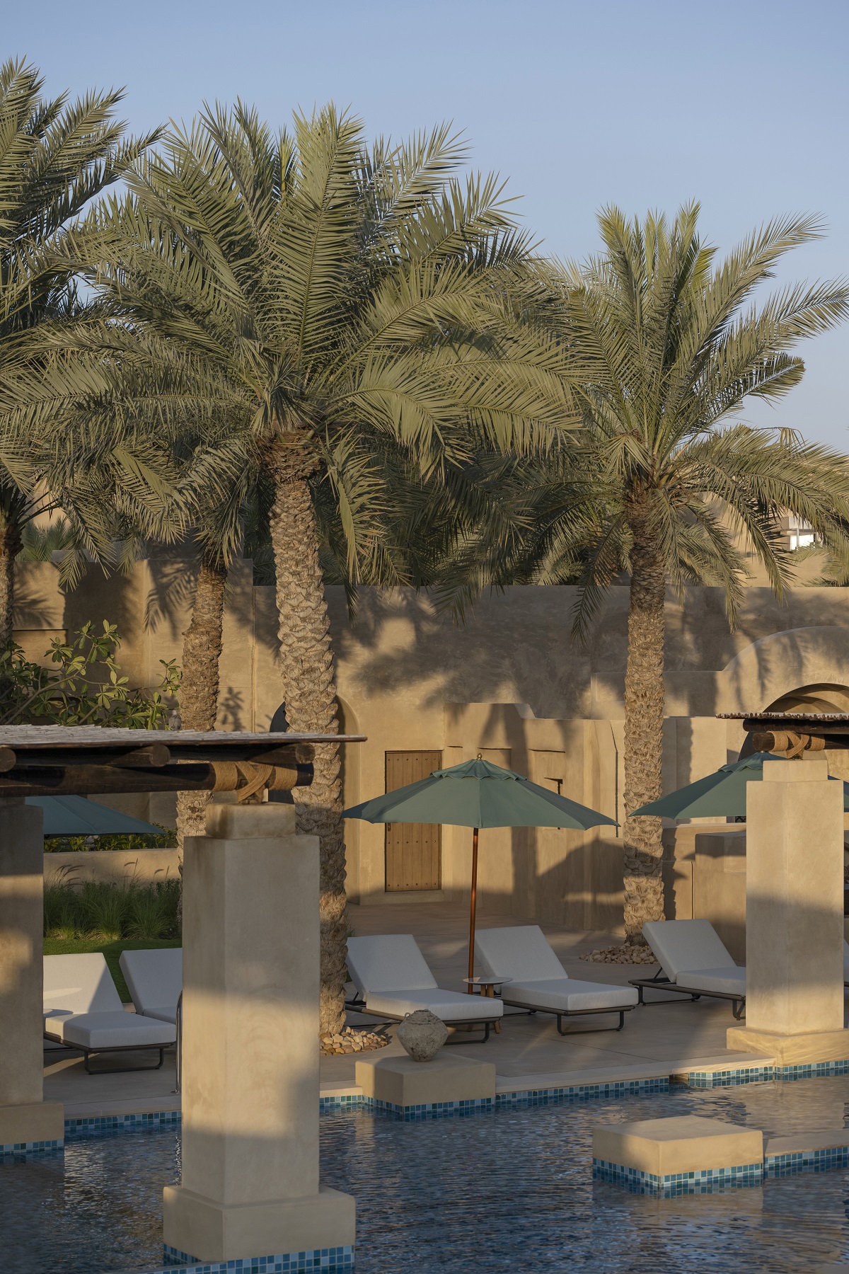 As visitors enter ‘the gateway to the sun’ through oversized doors, the grand driveway, landscaped by Square M, has lush palms and water features and well-preserved decade-old foliage that instantly transports guests into a forgotten world. The restrained palette of materials marries the barasti-style canopies, adobe walls and columns with the existing vernacular-inspired architecture. The new porte cochere provides a threshold with dappled shade providing an engaging guest arrival experience.