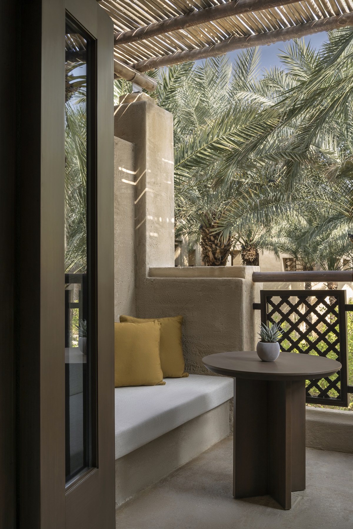 The design team also retained the novel concrete flooring integrating indoor and outdoor spaces. The indoor flooring has been re-finished with durable micro-concrete. The solid teak doors were stripped and stained to a more authentic natural timber tone, balancing the soft bastakiya colour palette synonymous with Bab Al Shams. Challenged by the original small windows and doors, the rooms have limited daylight, so a lighter colour palette and mirrors reflect light where possible. Studio Lumen paid extra attention to the lighting within the guestrooms to ensure a brighter and more spacious guestroom experience.