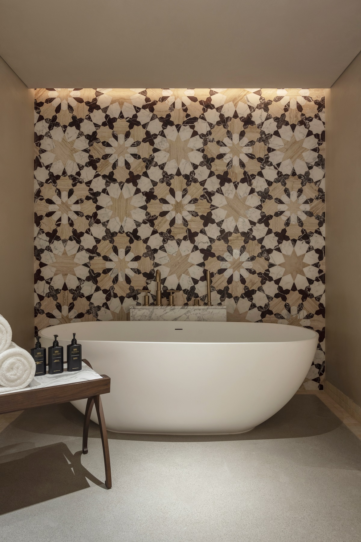A large shower, beautifully clad in marble mosaic, translates into a modern interpretation of Arabic patterns adding an authentic backdrop to the washroom. A stunning hand-carved vanity inset with mother-of-pearl inlay elevates the design to true luxury. A unique valet stand displaying the amenities adds a sense of extravagance to the limited space, with hand-picked items displayed on different tiers.