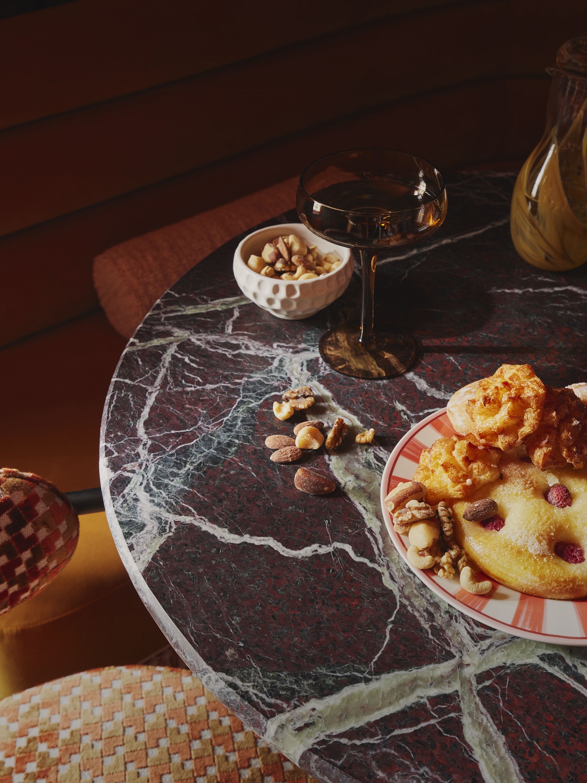 The interiors of the apartments have been curated as a series of boudoir rooms with colourful tones, luxurious materials, vibrant patterns and Art Deco details. Guests are transported to a bygone, yet fundamentally modern era, through bold character pieces including sweeping rolled banquette seating, deconstructed wardrobes and retro fittings. Elements of glamour are evident throughout with brass detailing, fringes, tassels and heavy dividing curtains ensuring a sophisticated feel to the apartments.