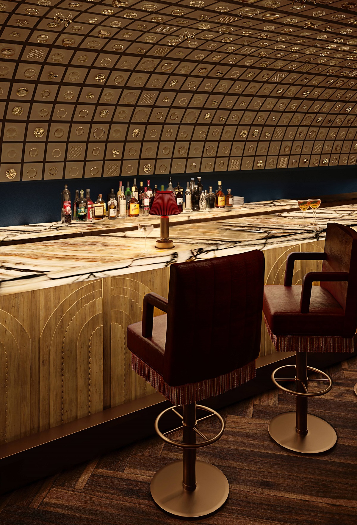 Once inside guests will be greeted with a sumptuous 60-seat main cocktail lounge in hues of gold, deep red, teal and imperial purple. “We used a decadent mixture of textiles and fittings throughout to really dial up the glamour in the space”, explained Soliman. “Think rich velvets combined with dark hardwoods and opulent gold detailing. The main space was inspired by the majestic train cars of the era and glitters with over 1,000 antique coins and bangles we sourced from the bazaars of Delhi and Jaipur, with the help of Delhi-based décor brand, Rosie Dahlia. The effect is quite spectacular.”