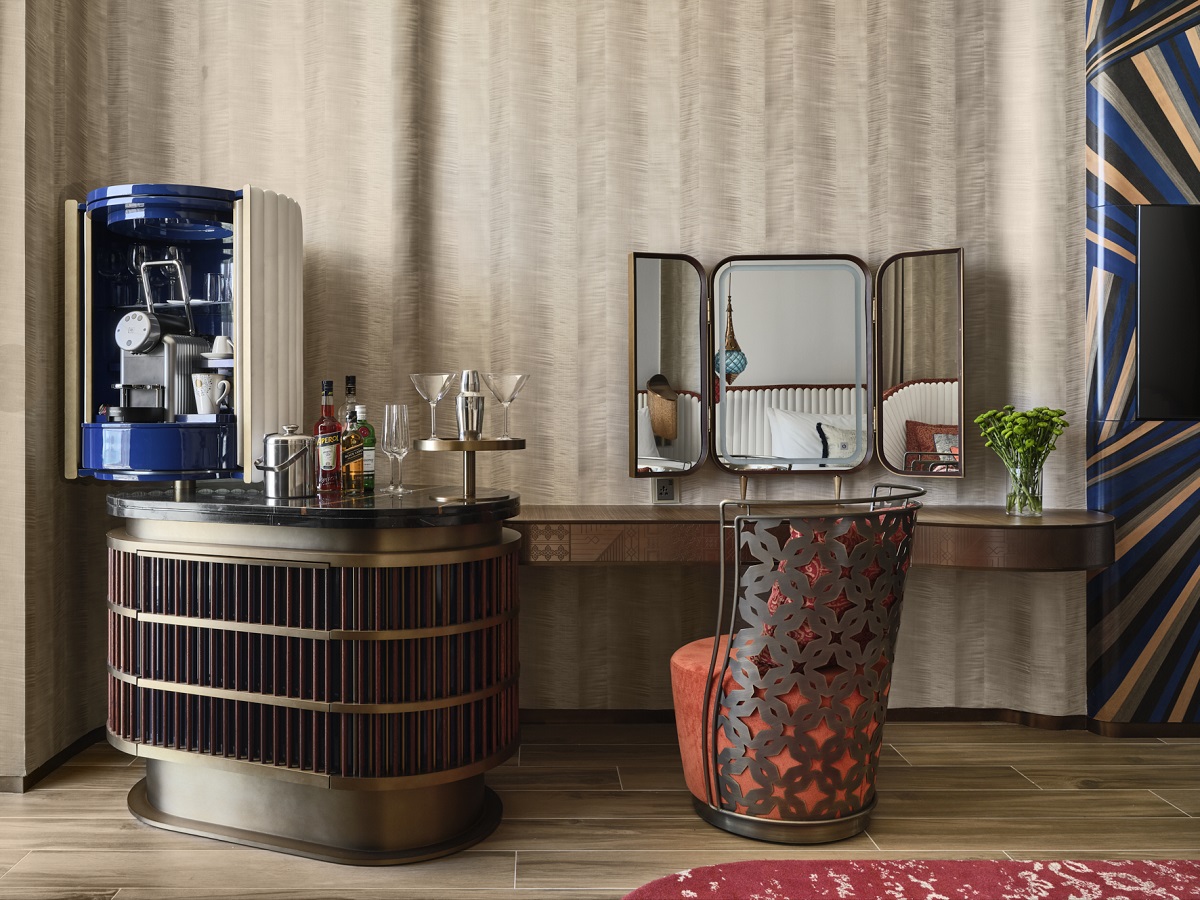 The concept translated into guest rooms and suites laden with lavish touches and hints of intrigue, adventure and romance. The bed headboards are white leather, with ribs and shapes inspired by dhows, as well as fabrics with motifs drawn from local calligraphy and being playful with paper. Lights echo ancient lanterns in colours straight from the Arabian Nights. The suites have been envisioned as a place to gather with friends for predinner drinks and gossip, or for a casual meeting. The beds have a luxurious seating area, with a tilted minibar in brass and dark blue lacquer, a social space where drinks can be served and a perfect place for lazy grazing. The walk-in closets are enclosed with billowing curtains in a gradient of sunset colours, echoing the hues of the bay, as the design team play with the idea of the secrets behind the veil. The storytelling theme extends to the bathrooms via a calligraphy theme, with bold black and white colours to echo ink and paper. The bathroom has its own seating area, encouraging long bathing rituals, cocktails and conversation.