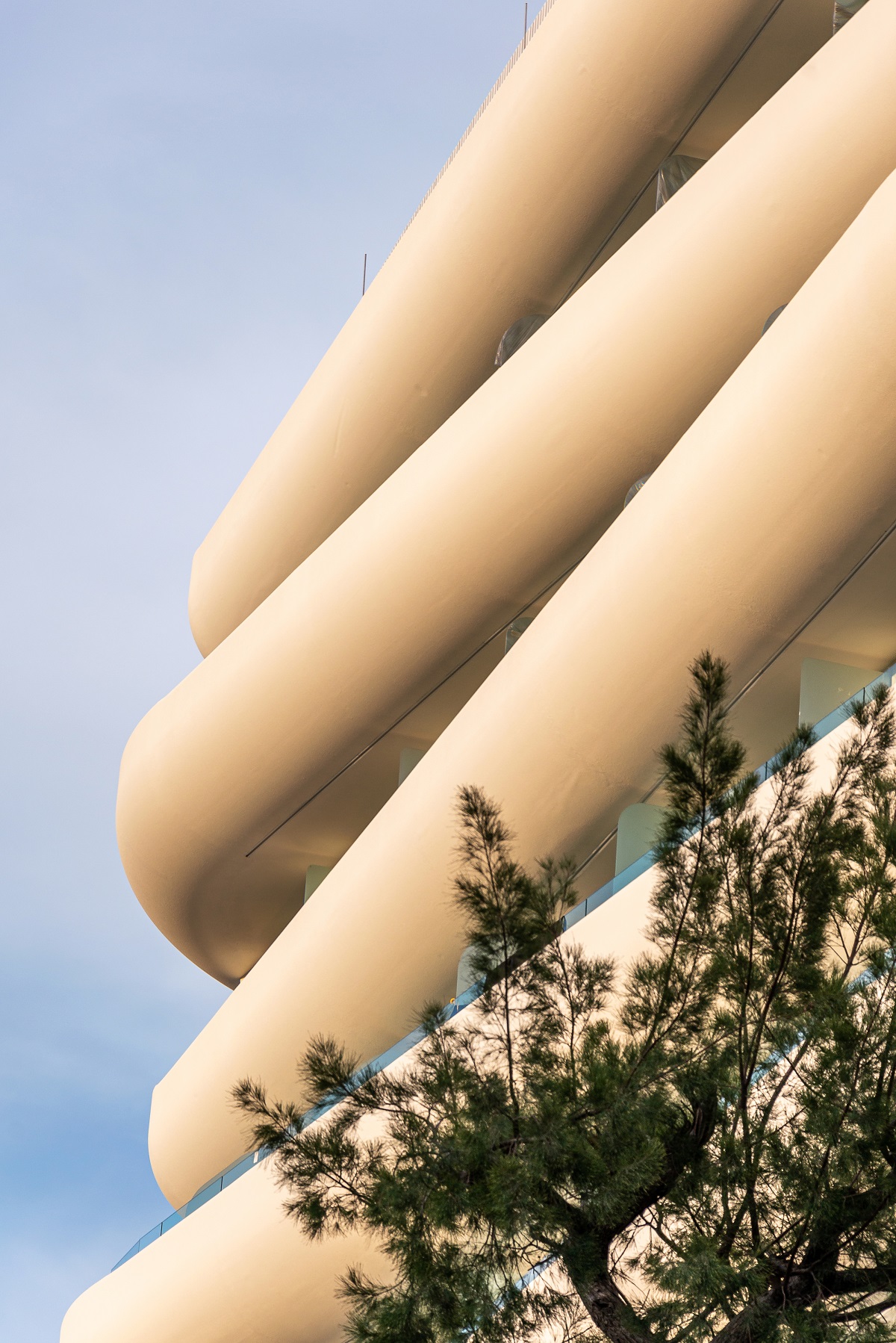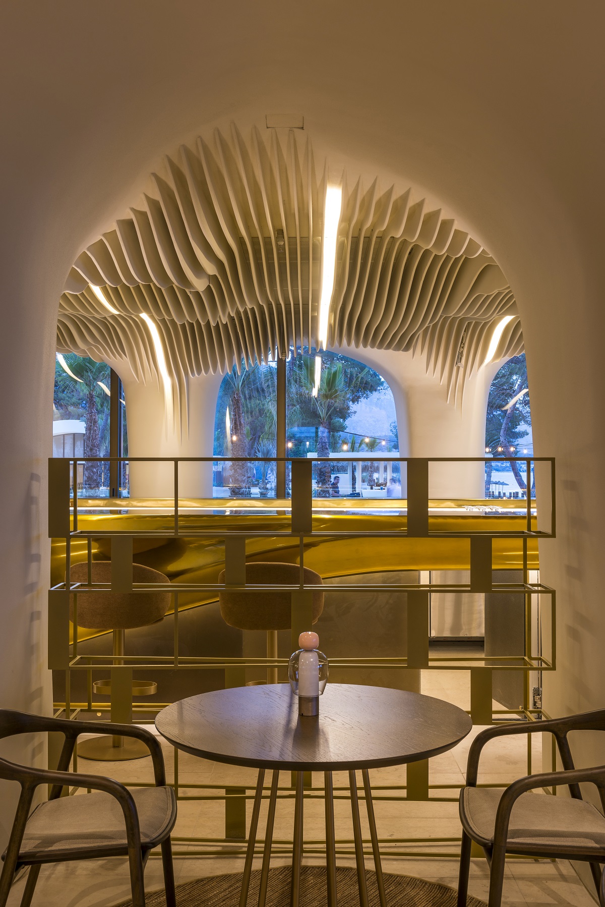 The sophisticated design concept champions an organic and light-filled colour palette and strong architectural form, with the intention of the structure to appear as an extension of the surrounding landscape. Inspired by the northern Aegean volcanic arc and the Greek myth of the Giant Typhoeus, who resided beneath ‘Sousaki’; a craterless volcano that has laid dormant for 2.7 million years, Typhoeus was so tall that he rose above the mountains with his head touching the stars. This idea is rooted in the concept of Isla Brown Corinthia, with the hotel’s design intended to embody the volcanic eruption of Typhoeus, harmoniously marrying the earth with the sky through a continuation of the physical form and the vast land and sea that surrounds it. The result is a contemporary structure that manifests clean, smooth lines like pebbles stacked upon each other. Cohesive with the external design, the hotel’s interiors mimic these soft and fluid forms, with a curved line motif and earthy colour palette of stone, white and brown, finished with bronze detailing and tinted mirrored walls.