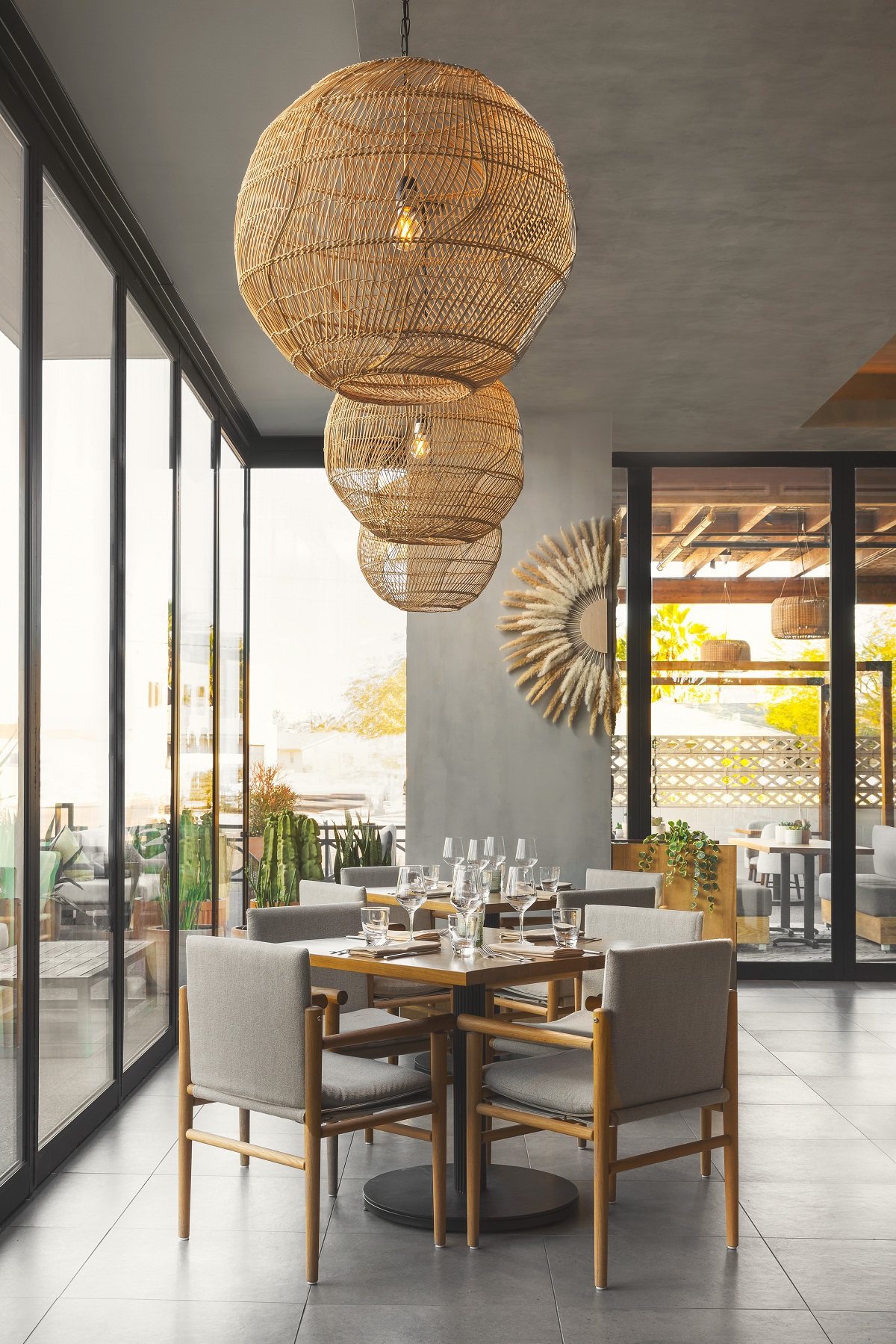The space was designed to reflect the merging of two worlds: the sanded, textured desert and the fresh and airy coast. To complement the chef’s fresh cuisine, the design incorporated lighter wood tones, neutral textures and materials that reflect its location and the coastal environment. The lime wash walls give the space a subtle depth without making the space feel busy or overwhelming. The handcrafted terracotta pots, native to Arizona, are displayed in repetitive and elongated limewashed arches at the entrance,feeling as if you are stepping from a southwestern desert onto a European beach.