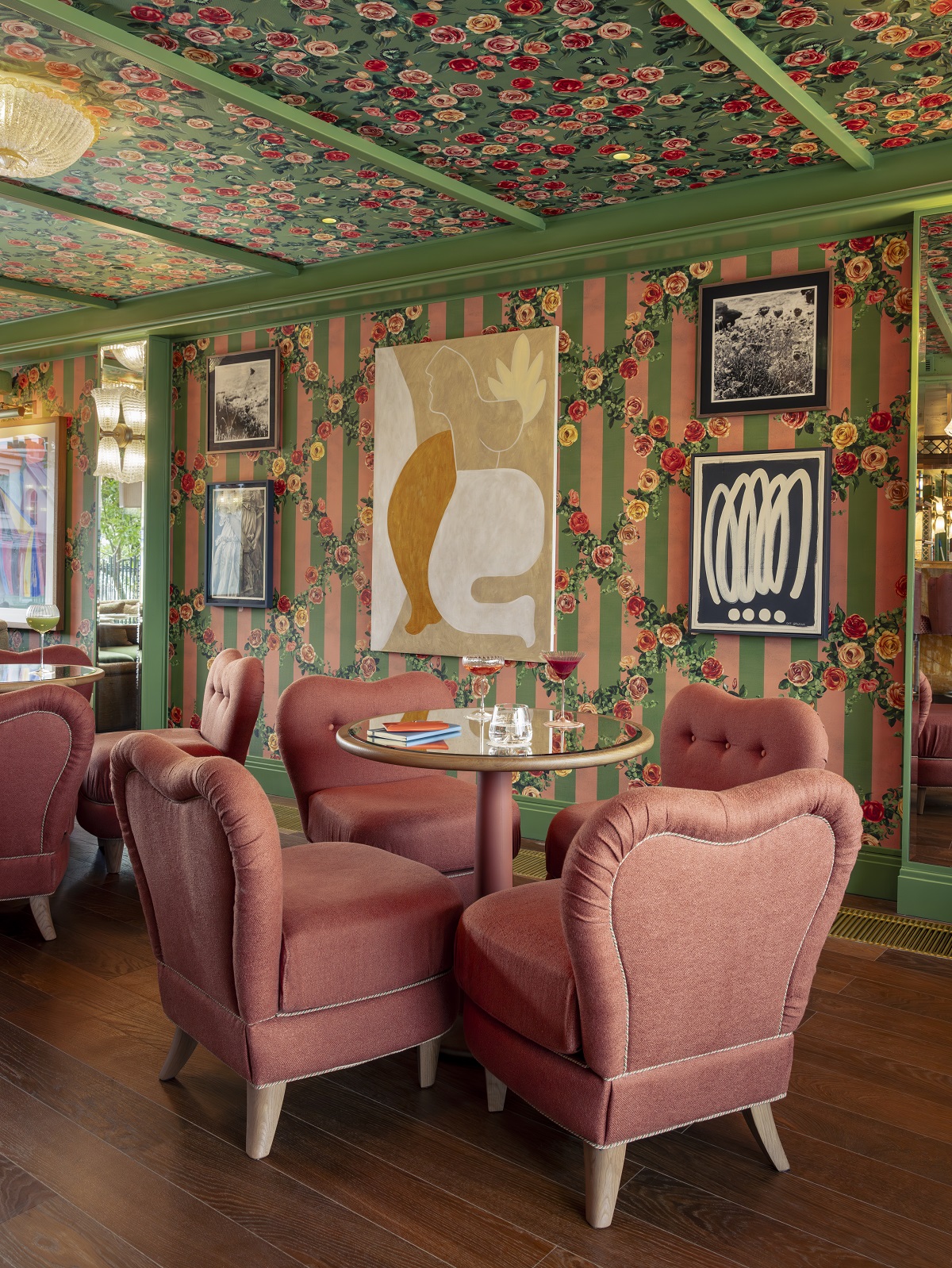 Today, La Fantaisie memorialises the history of this market street through the interior design. On arrival, I opened the entrance lobby doors and was immersed in a spring-time palette of vivid greens, pinks and yellows. The ceiling and columns are clad in a leafy green tapestry fabric, bringing the garden inside. Whimsical shaped furniture and Murano glass lights, characteristic of MDBS, create an atmosphere of joy. In a conversation with Martin Brudnizki he said he “introduced these natural elements into the scheme to ground the property to its location whilst providing a revitalising and restful escape to both tourists and locals using the amenities.”