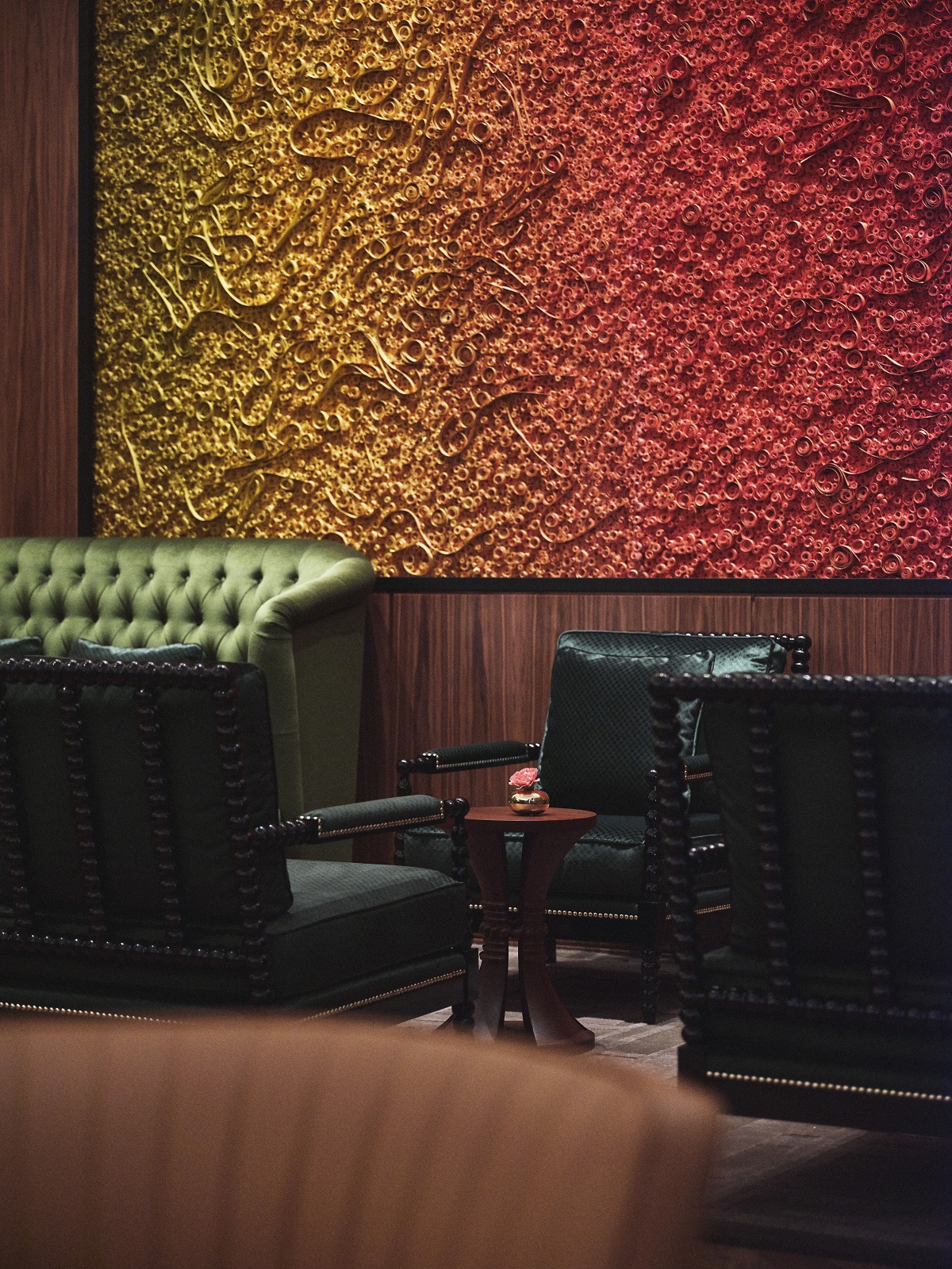 The Nine Elms Bar & Lounge warrants a visit not just on account of its extensive cocktail list, but also because of its collection of striking modern artwork which adorns the wooden panelled walls. A mix of high-end and sophisticated materials have been used in here, such as white marble, terrazzo, brushed steel, antique-finished bronze, oiled walnut and soft fabrics, while a unique lighting installation with 296 hanging lights creates a dynamic and glamorous feel.
