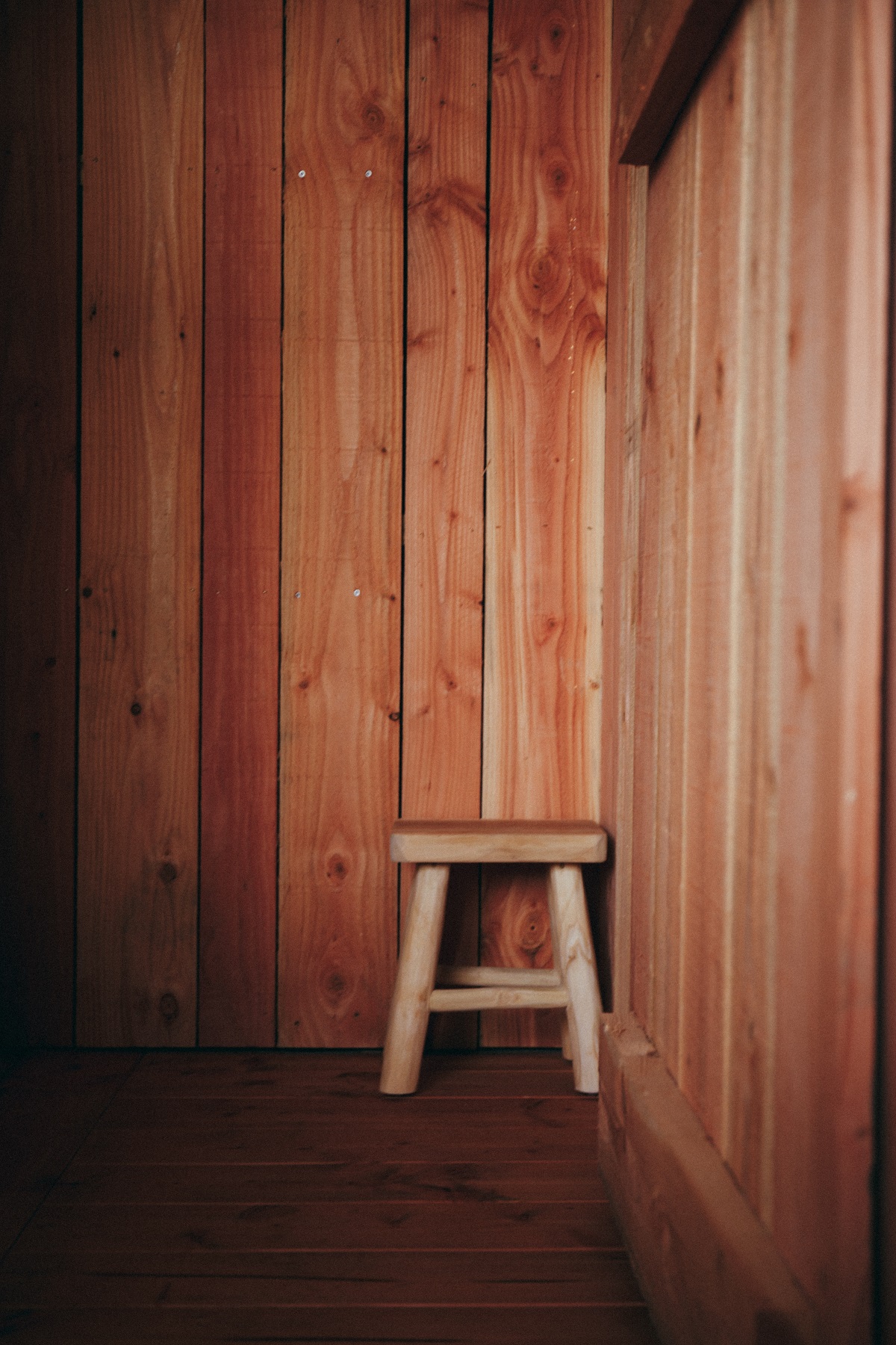 In addition, the wooden furniture has been specifically designed to blend in with the architecture of the cabin. Positioned in the centre, the bed also serves as a space divider in the bedroom. The lounge area is created by a simple curved bench and a coffee table. Opposite, guests can find the coffee and tea amenities. Towards the back of the cabin, screened by the headboard, the washbasin and dry toilet have been integrated. Finally, the wardrobe and shelving unit complete the layout in the opposite corner.