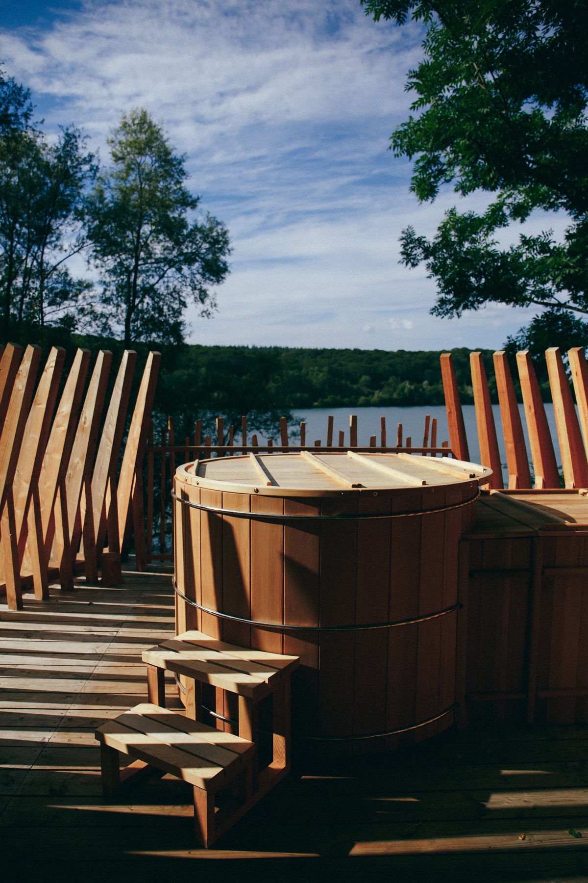 The first level, raised on stilts, opens onto the view and the gentle breeze. This vast, protected terrace allows guests to live outside, sheltered from the sun and rain. The second level houses the bedroom. The open bay windows allow the space to be naturally ventilated, whilst enjoying the views. The third level features a Nordic bath. This is where guests can unwind, immersed in the water and the treetops. At this height, the views are breathtaking. Whether by oneself or accompanied, the terrace allows guests to soak up the views whilst reconnecting with the ever-present natural world.