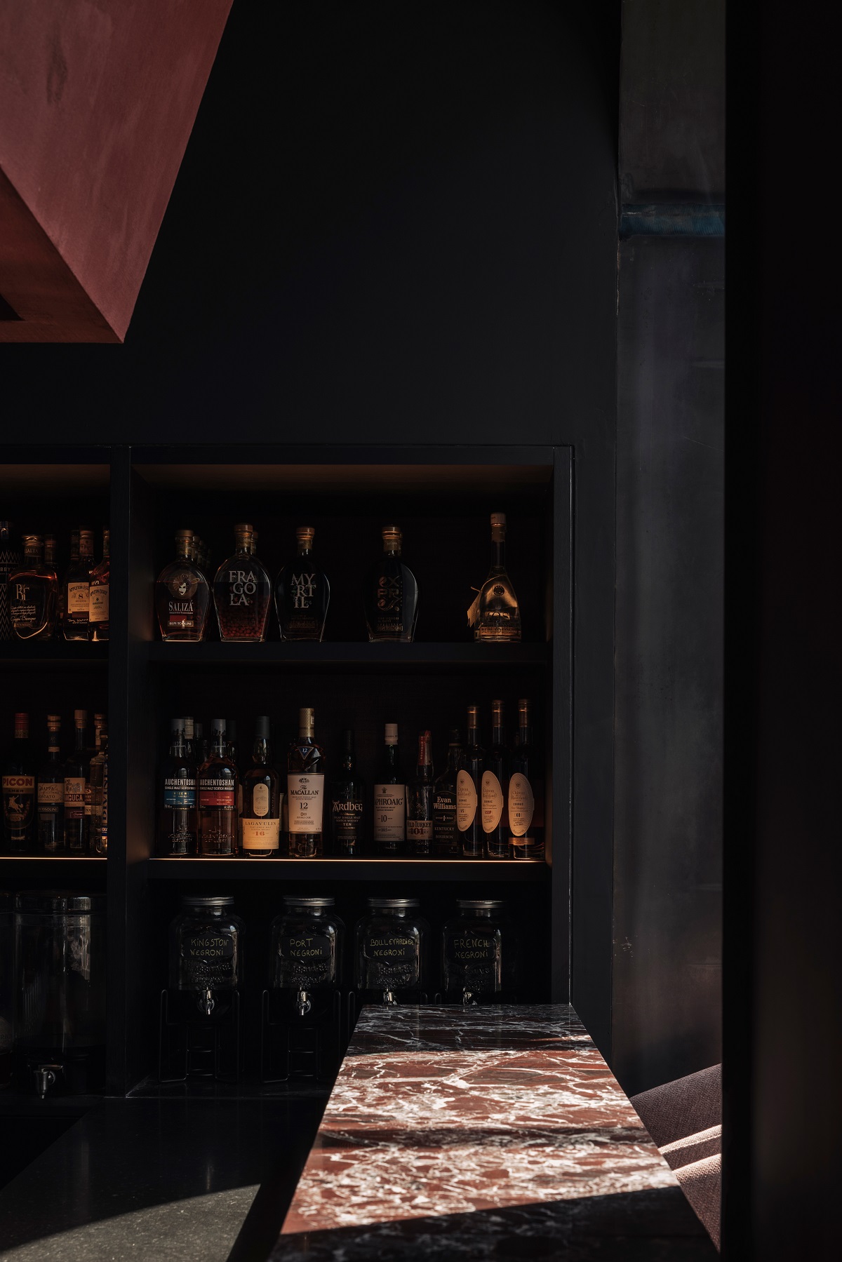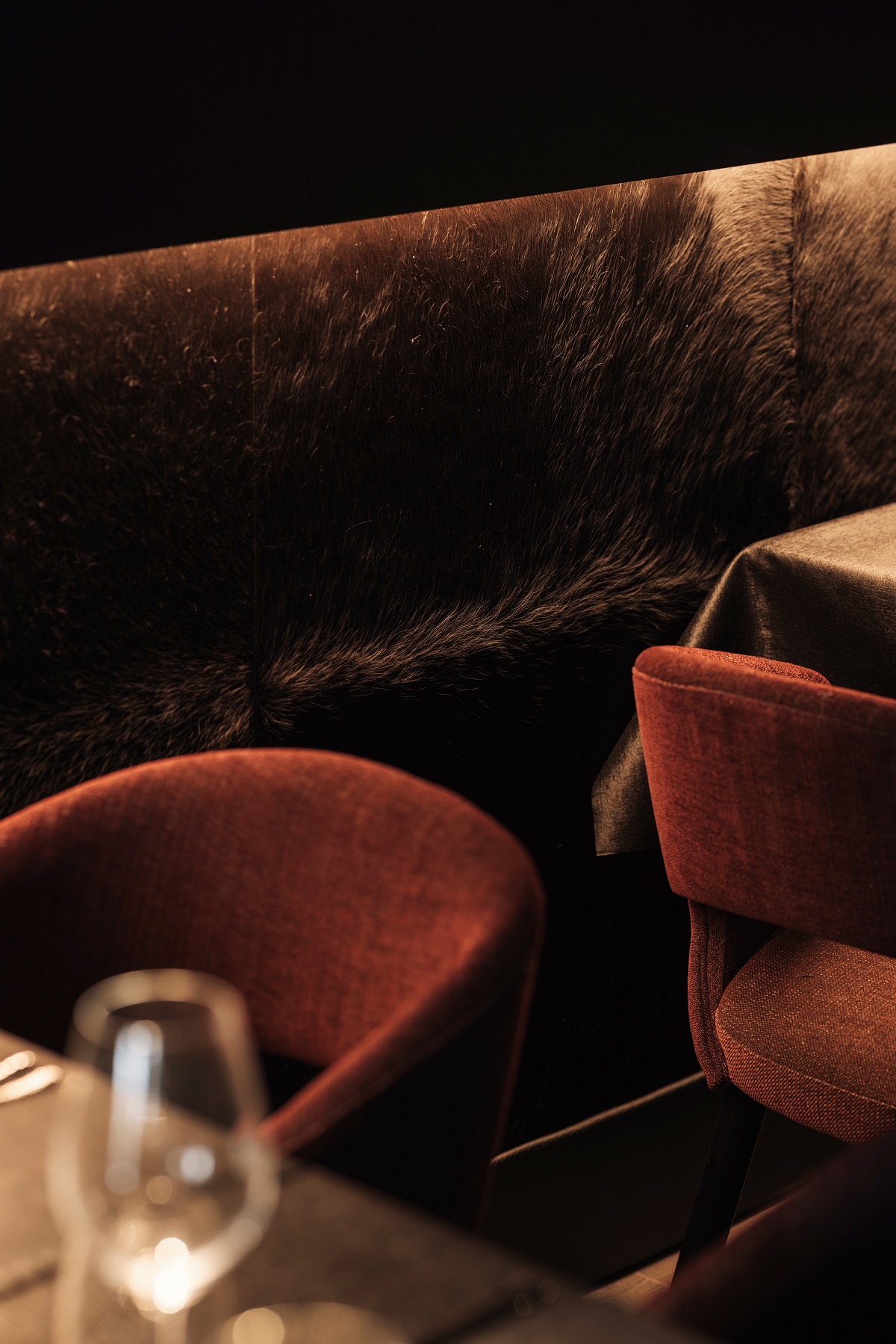 In the bar, a burgundy red volume above the bar sets the scene. The bar itself is a proof-point of luxury with dark veneer, velvet fabrics and leather detailing. The marble countertop has dark red veins, referencing the meat dishes served in the restaurant. Subtly lit wall panelling upholstered in tactile cow hide offset wine-coloured sofas.
