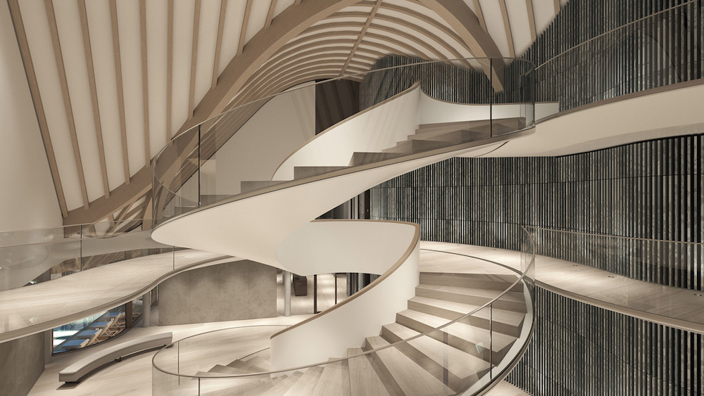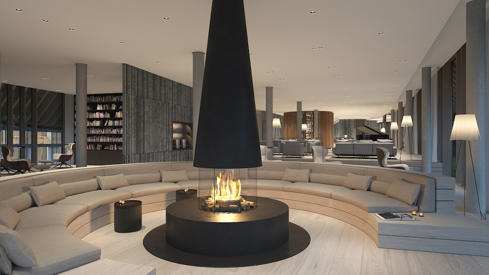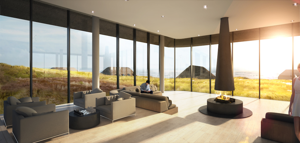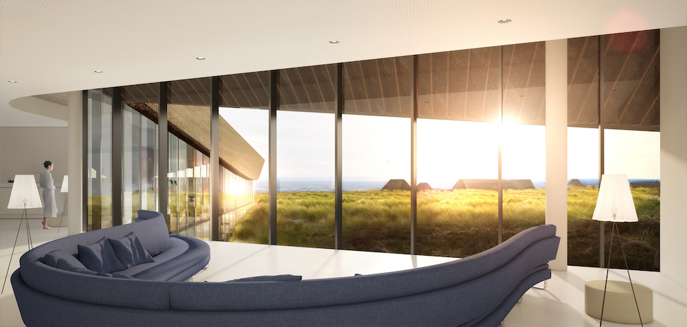 Housing 55 rooms and suites beneath Europe’s largest thatched roof, the resort will have a combined guest area of more than 20,000m2. In addition to the main building, the resort will feature two interconnected saltwater indoor and outdoor pools complete with counter-current system and a five-story freestanding spiral staircase centrepiece. A continuous glass facade, the largest on Sylt, will give the impression that the thatched roof floats above, giving the property a weightless character that blends seamlessly into the rolling dunes and landscape beyond.