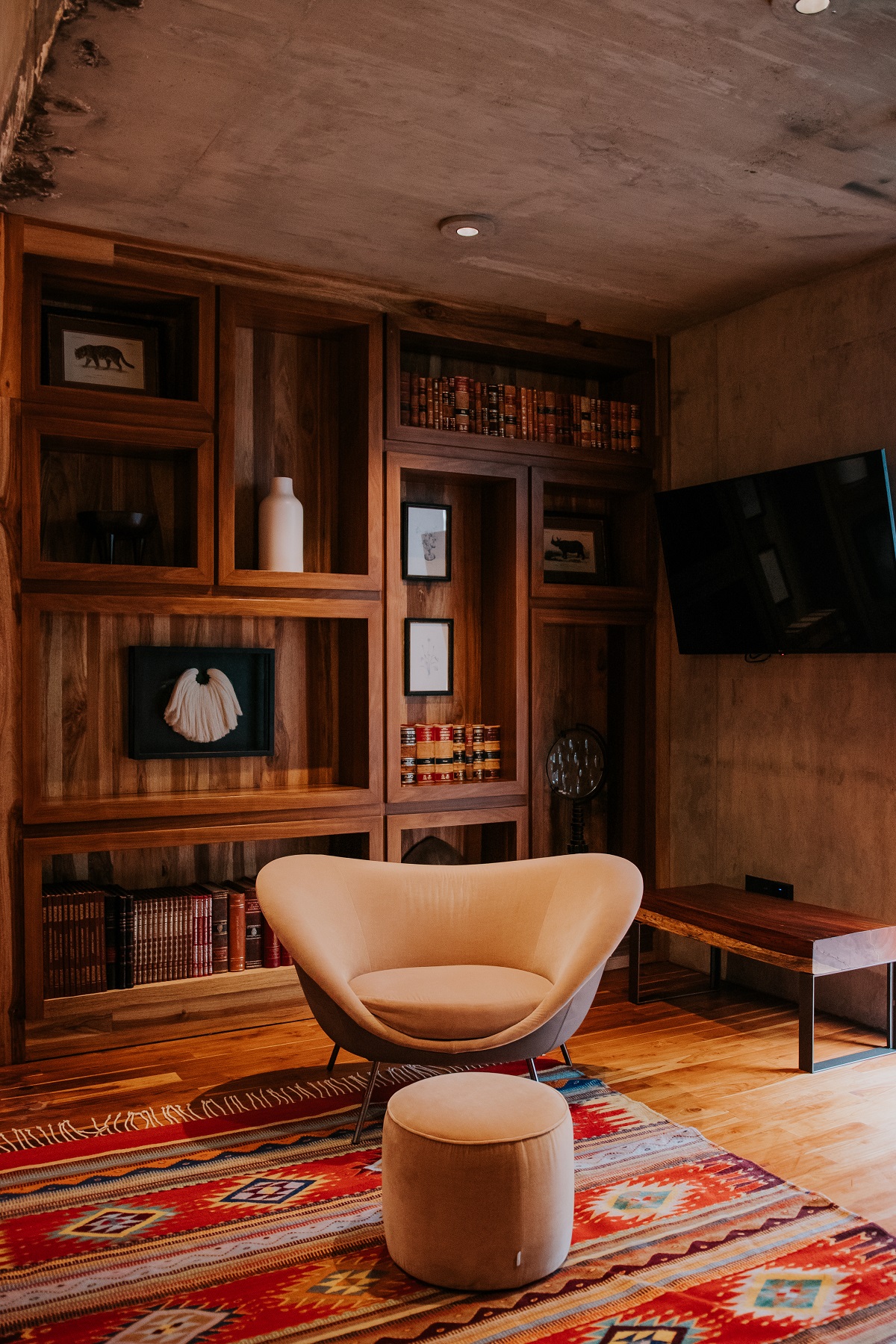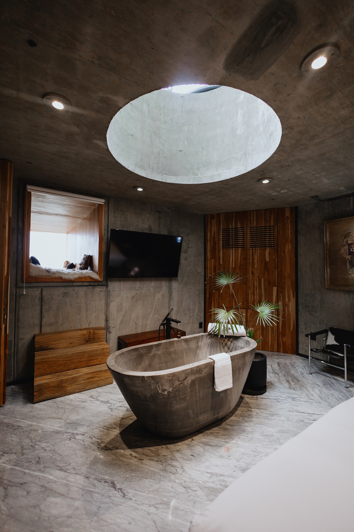 A singular characteristic of Flavia hotel is the sensory impression produced by each of its rooms, all of which are unique while maintaining a dialogue with each other. An example of this is Bunker, an underground room that is so well illuminated it becomes the antithesis of its name. Likewise, luminosity is a feature of both Nubes and Copal rooms, the latter dominated by striking picture windows. The Teatro room, as its name suggests, emphasises the dramatic character of a space that invites introspection, while Kundavi, Biblioteca, Cuarto de Máquinas and Xolo embrace the warmth of woods as a leading element. Finally, in Roja, Selva, and Kuni rooms the contrast between textures is the principal theme.