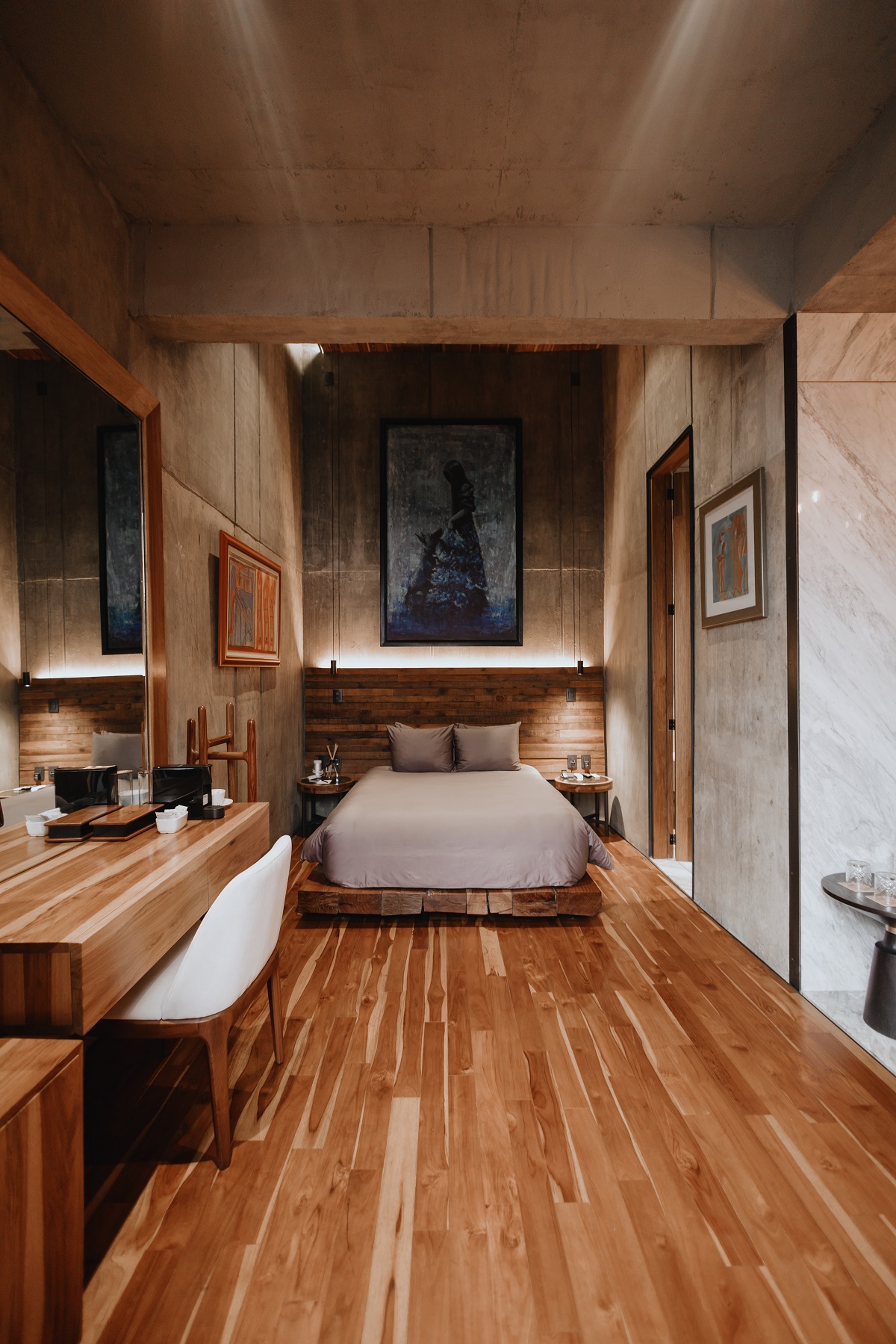 The hotel façade is dominated by the rustic character of raw concrete, contrasting with the warmth and elegance of the interior. The colour palette of the public spaces and suites was built around five earth hues that harmonize with the tropical timber and the omnipresent force of the concrete.