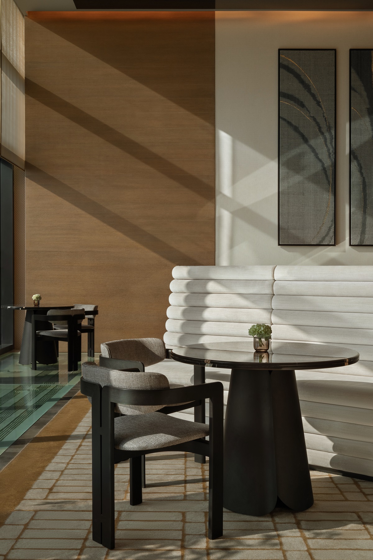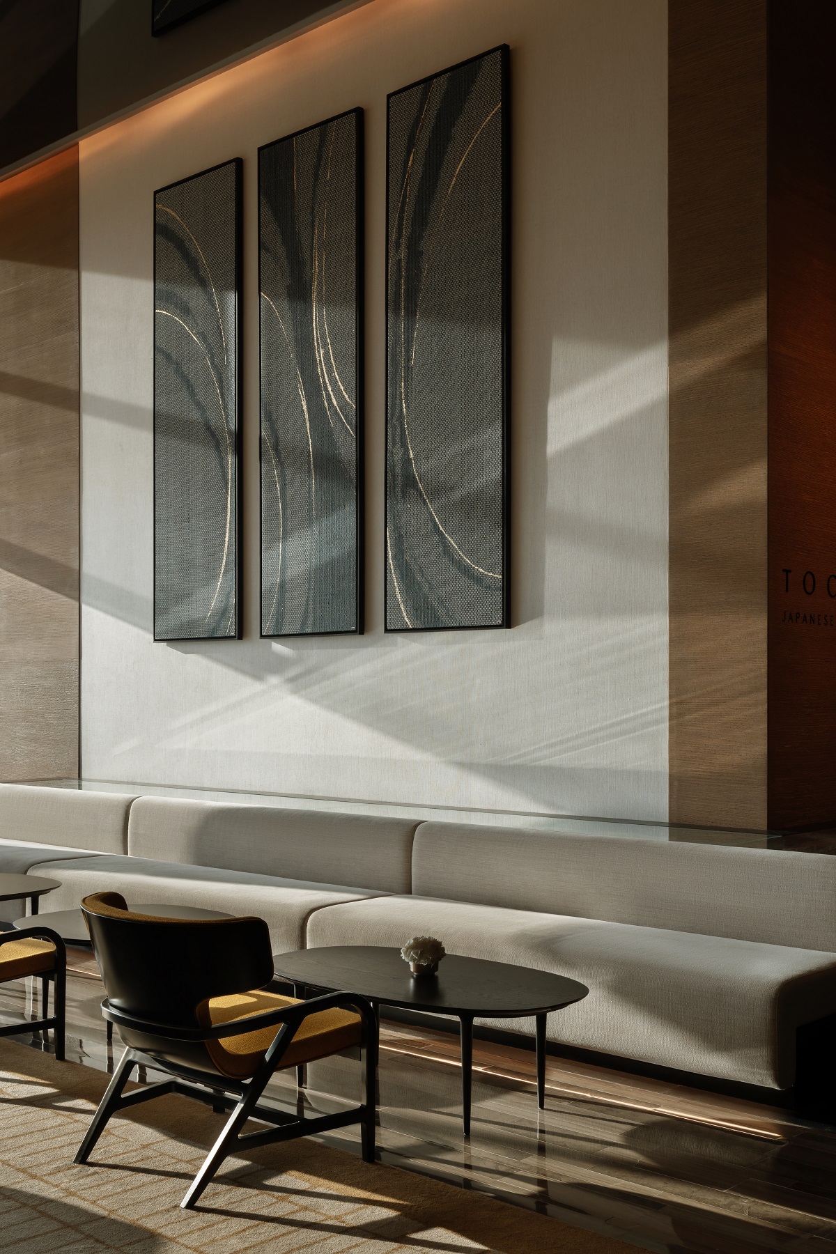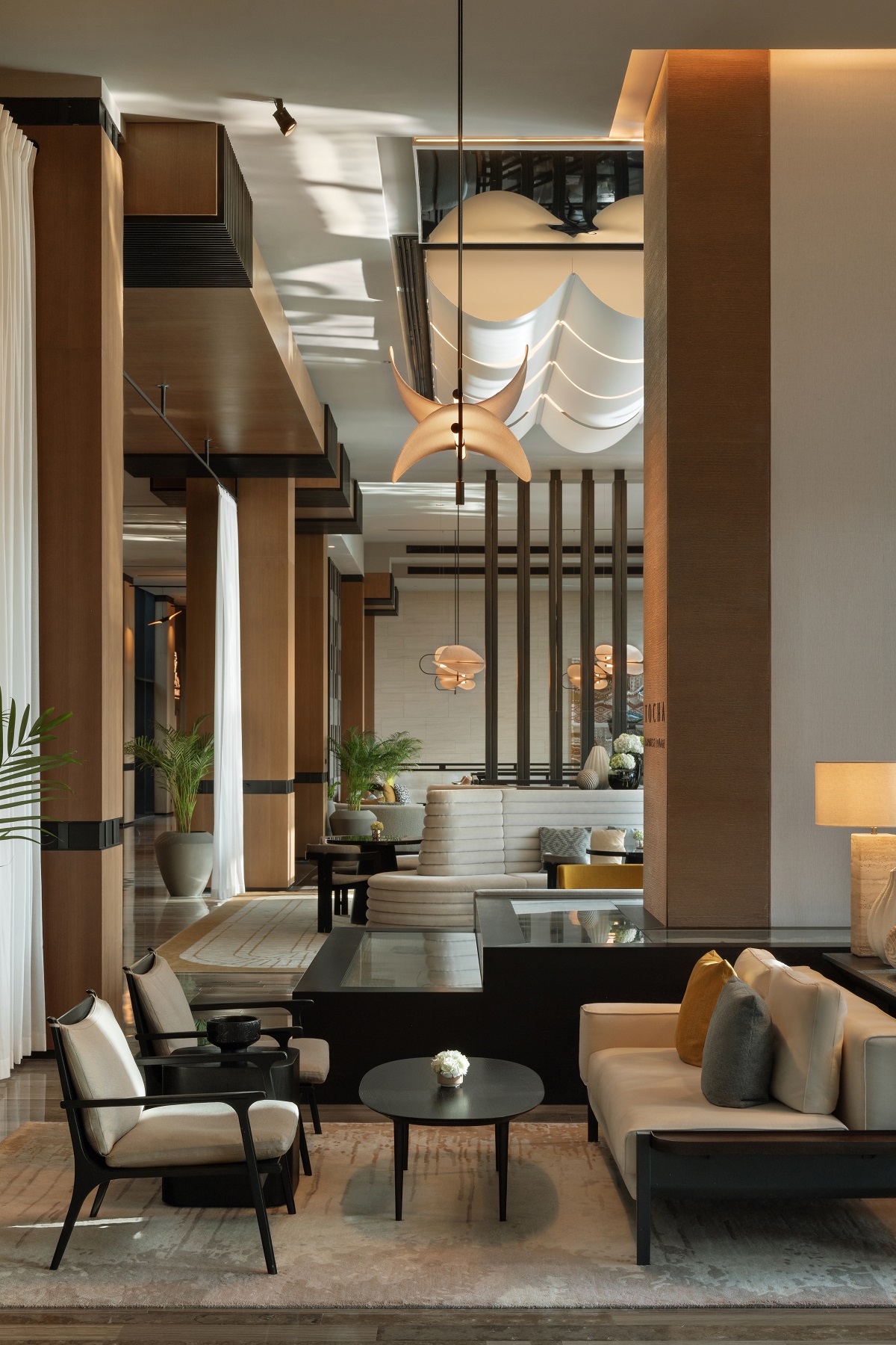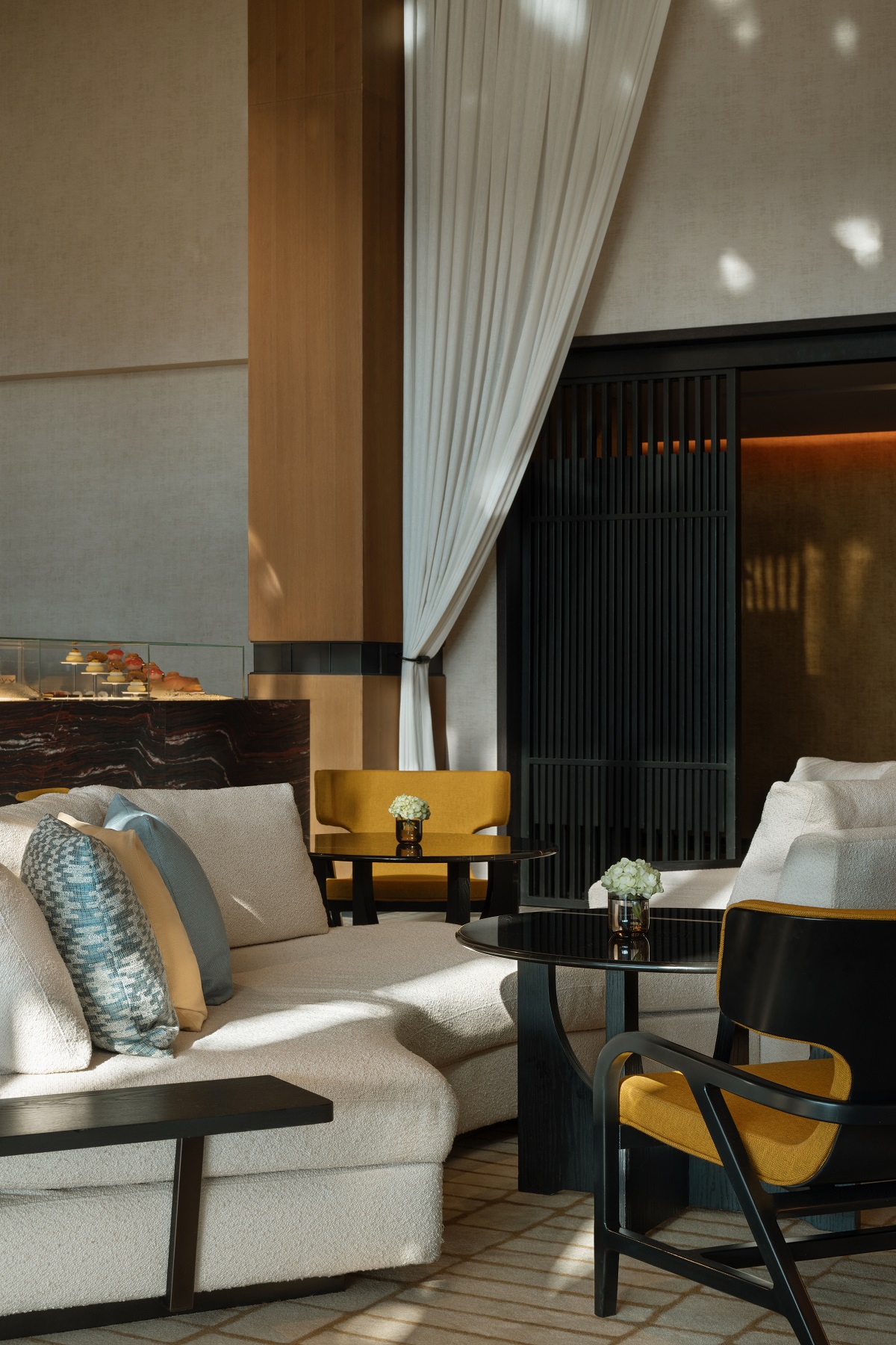 Inspired by desert landscapes, the lobby becomes a modern mirage: soft lighting, filtered through sheer drapery and ceiling coves, is enhanced with materiality and spatial layering. “There’s an immediate sense of calm and retreat,” added Nagata. “The arrival experience – defined by softly screened partitions – creates a gentle transition from the fast-paced city outside to a tranquil sanctuary within.”