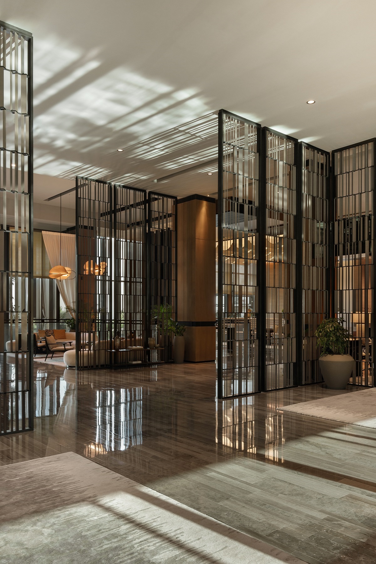 The transition between spaces within the hotel is fluid and cohesive, guided by a consistent palette of natural textures and tonal restraint. Screened thresholds and varying ceiling treatments help define zones while maintaining openness. “Each area flows into the next through subtle shifts in materials and lighting, creating a spatial journey that unfolds gradually,” explained Nagata.