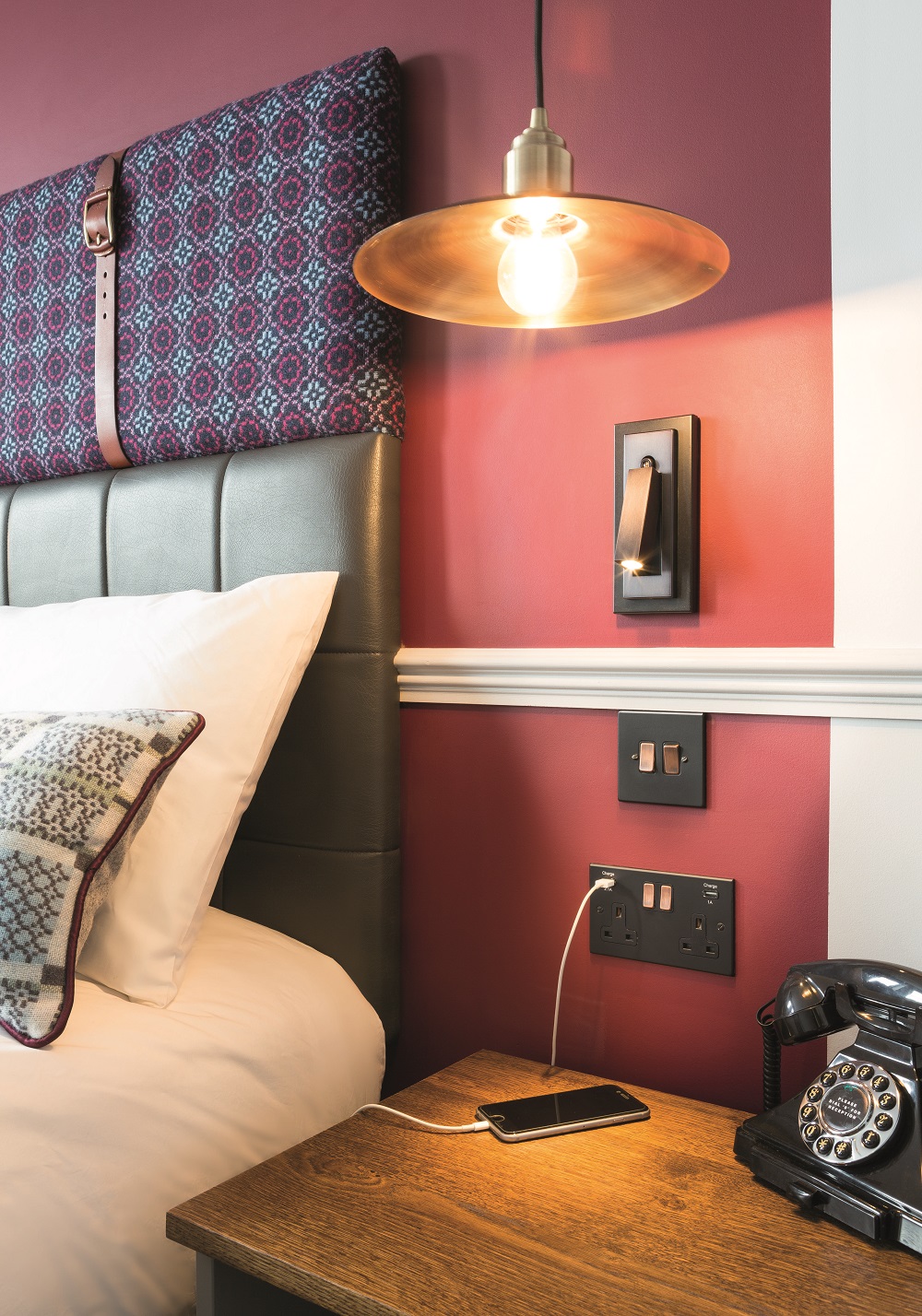 Hartland 1, 2 and 3-gang rocker switches were specified for lighting. 2-gang dual-switched sockets were selected for power supply while dual-switched sockets with two USB charger points were fitted at bedsides. The 1A rated USB port is for mobile phone charging and the 2.1A port is for tablets and other devices, supporting modern guest demands for 24/7 connectivity.