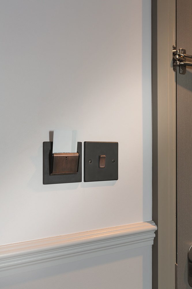 Hamilton’s hotel key card switch welcomes guests, while a European SCHUKO and dual USB 2-gang switched socket was fitted in a bespoke plate above the vanity table to make European visitors more comfortable.