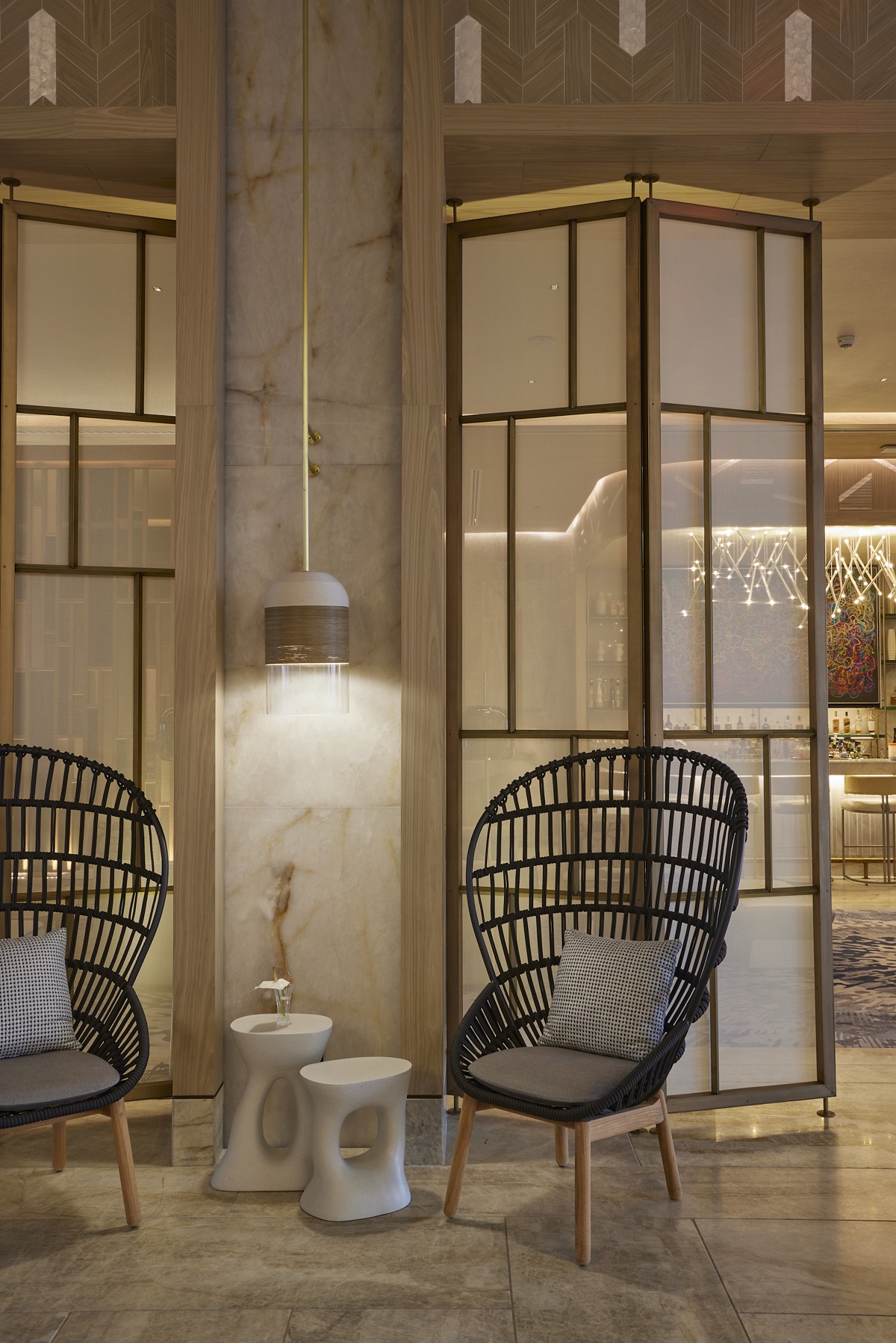 Inside the lobby lounge, guests’ eyes are immediately led outward to the cascading view beyond, framed by marching stone portals that emphasise the formality of the architecture and underscore the dramatic volume heights, crowned by twinkling chandeliers. Soft, moody lighting accentuates the material palette, where raw and polished stones combine with natural woods, warm metallic and pearlescent notes and carpet patterns that emulate the movement of water. At the centre is the signature Waldorf Astoria clock, designed with lightweight transparency to maintain a visual connection to the sea and adorned with jewelry-like rings and pearl-accented pendulums.