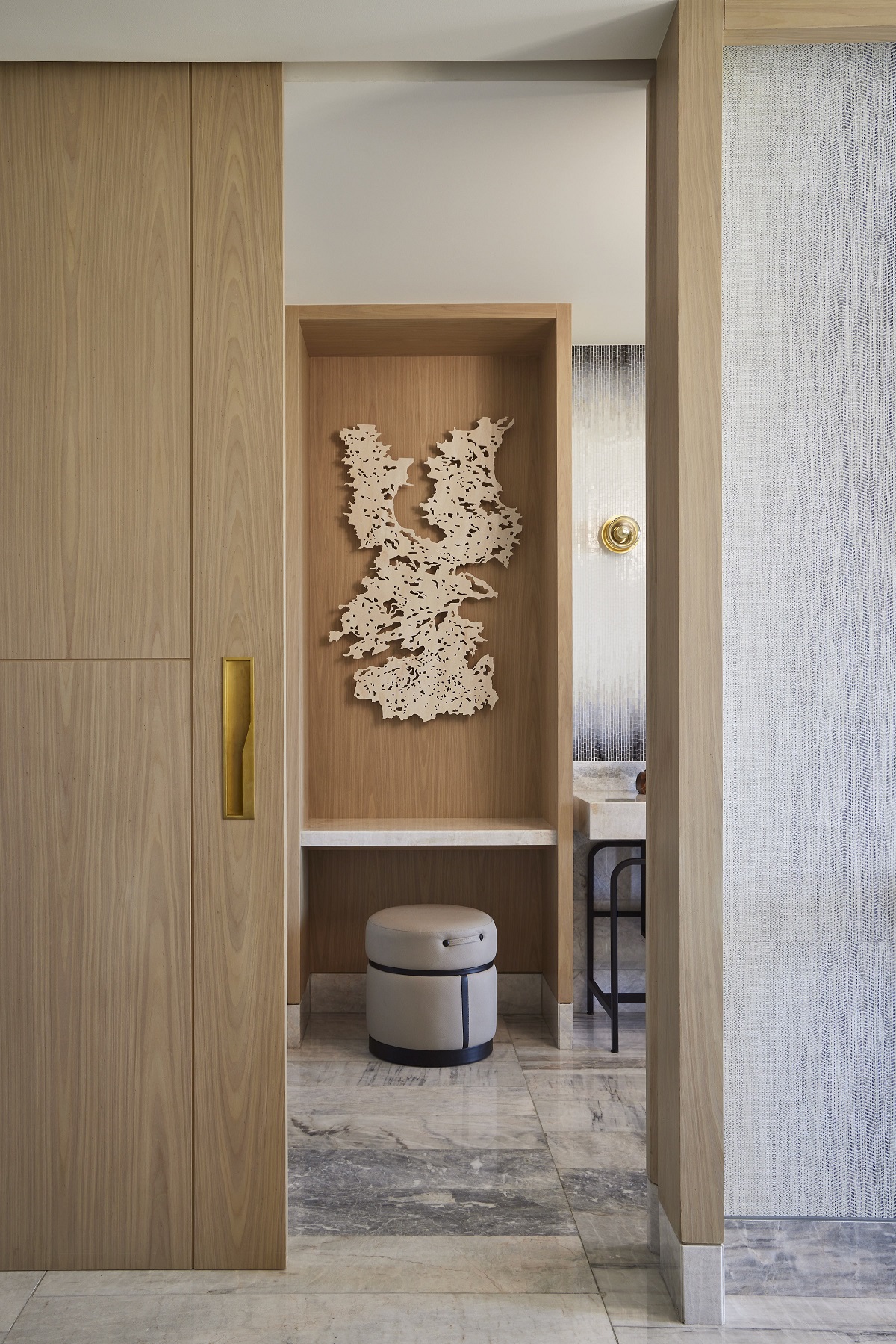 An indoor-outdoor connection defines the design of Waldorf Astoria Spa. Beyond the double glass doors, guests traverse a lush corridor, fully open to the landscape on one side. Each treatment room is complete with its own private water closet, vanity, shower and changing area. Couples’ treatment rooms boast the addition of a luxurious private two-person tub.