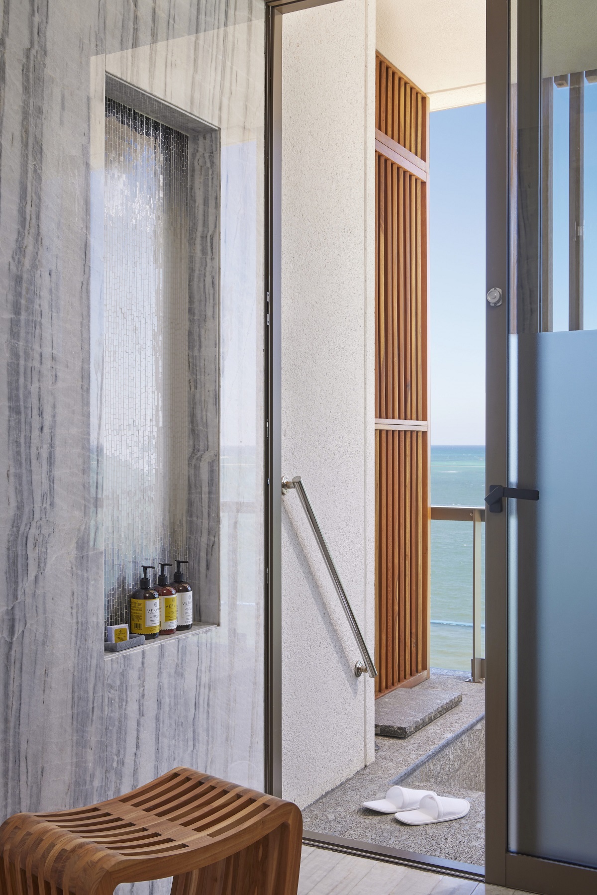 The bathroom experience spans the room’s entire length of the room and is defined by a dramatic wet vanity against a bold, blue ombre mosaic wall. Artwork explores the delicate detailing of coral. The shower experience is one to remember, surrounded by large, book-matched marble slabs and world-class views through the floor-to-ceiling windows.