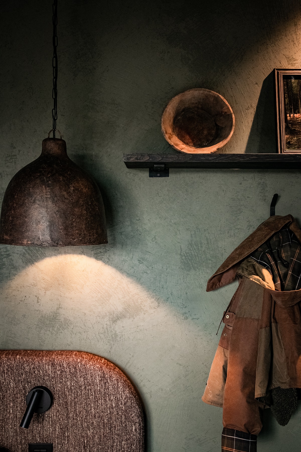 A colour palette of tobacco and soft ochre interplays with calming tones of misted black and textured green, mimicking the chiaroscuro of sunlight and shadow, that can be observed through the floor to ceiling windows, that face out into the green expanse. The tones have been carefully selected to add richness to the interior, without overstimulation. The materials – wood, stone, hessian – belie their natural origin, and speak to their hyper-locality to the region. A signature feature of any Geraldine Dohogne Design, the materials are intrinsic to the landscape.