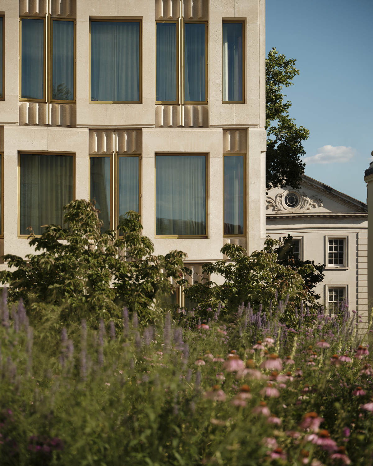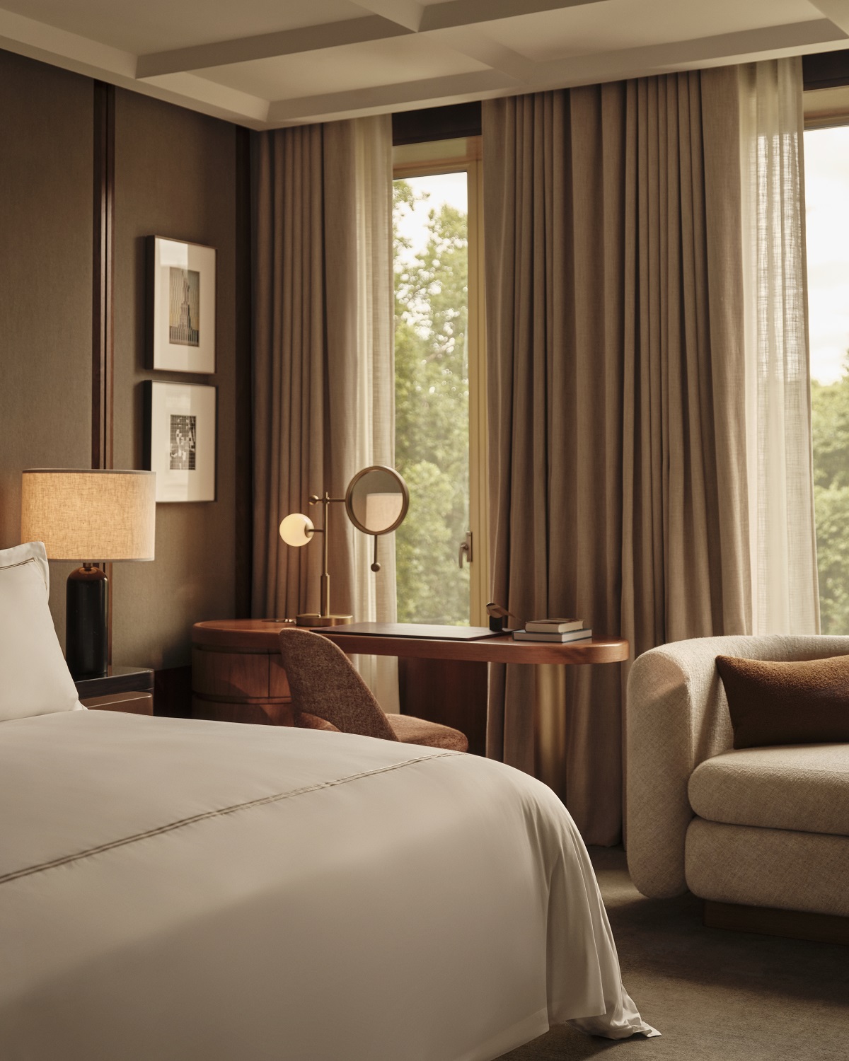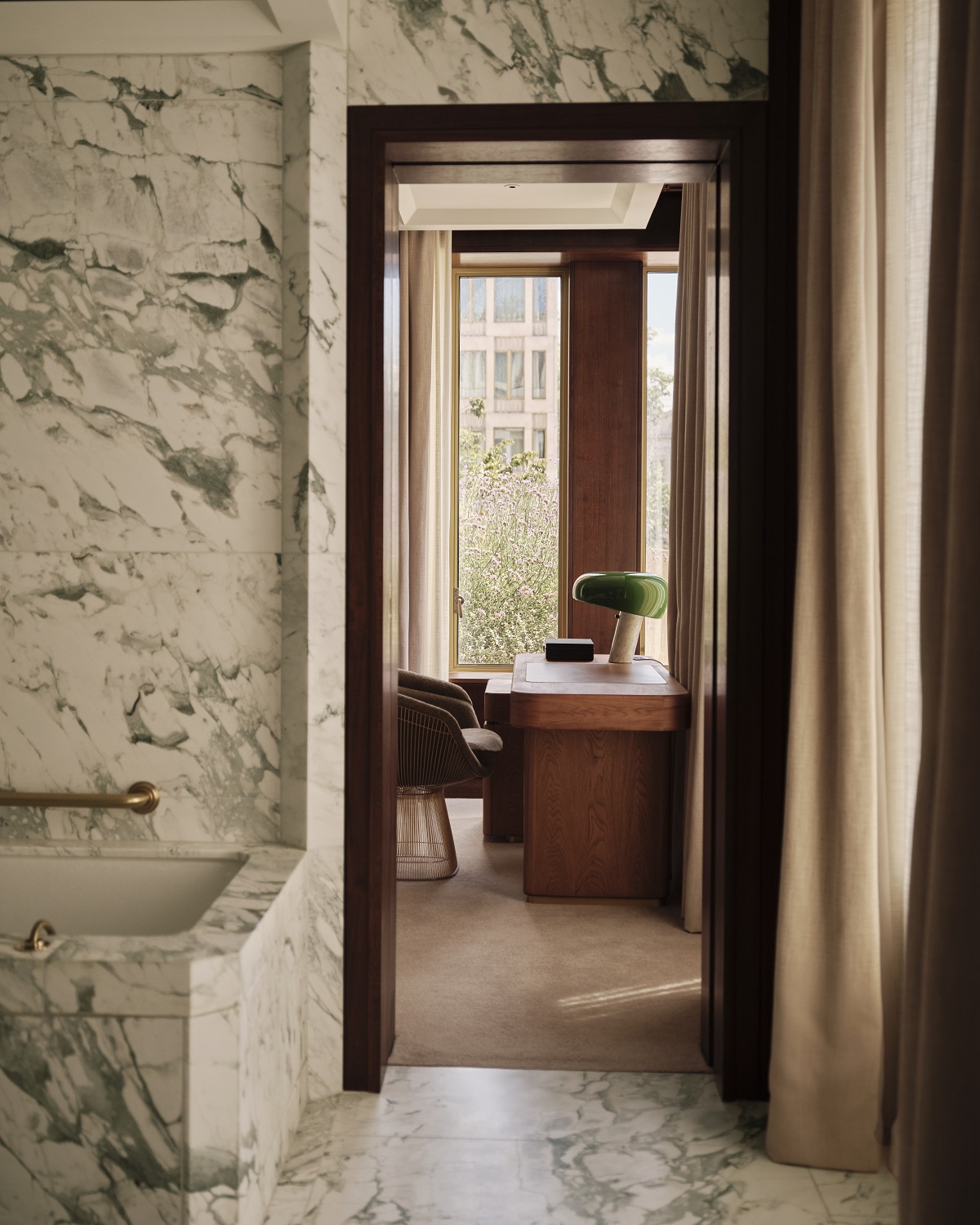 The building’s distinctive angular, original diagrid exterior gives way to interiors of refined sophistication, where sleek modern lines meet plush textures. Interiors of the 144 spacious and thoughtfully designed suites have been led by Joseph Dirand. Each reflects Dirand’s vision of celebrating craftsmanship and the property’s storied past to create a calming and inviting atmosphere. Bathed in natural light from the floor-to-ceiling windows that give way to some of the capital’s most captivating views, the transformation stands as a testament to timeless elegance and innovation, with a colour palette of warm tones punctuated with gold anodised aluminium accents that complement the building’s original stone façade.