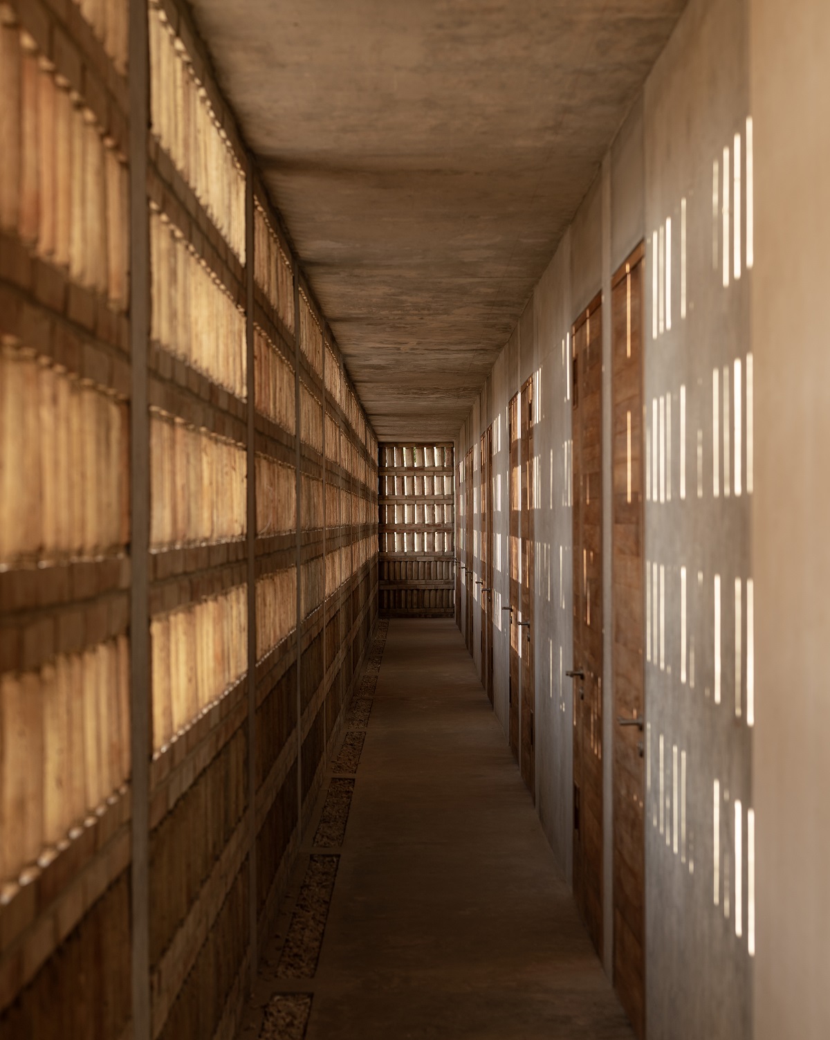 Atop and among the concrete structures — a material used for its thermal properties to keep indoor spaces cool as temperatures rise — guests and locals alike will discover a serene rooftop garden and a central courtyard with a pool, sun loungers, restaurant, and bar, and an Outdoor SPA featuring a sauna, two cold plunges and a massage room for rejuvenation. On the roof, light snacks and drinks can be enjoyed while watching the sun set over the ocean or cosying up around firepits. In the courtyard, lush tropical vegetation surrounds a large pool and creates smaller nooks amongst the poolside loungers.