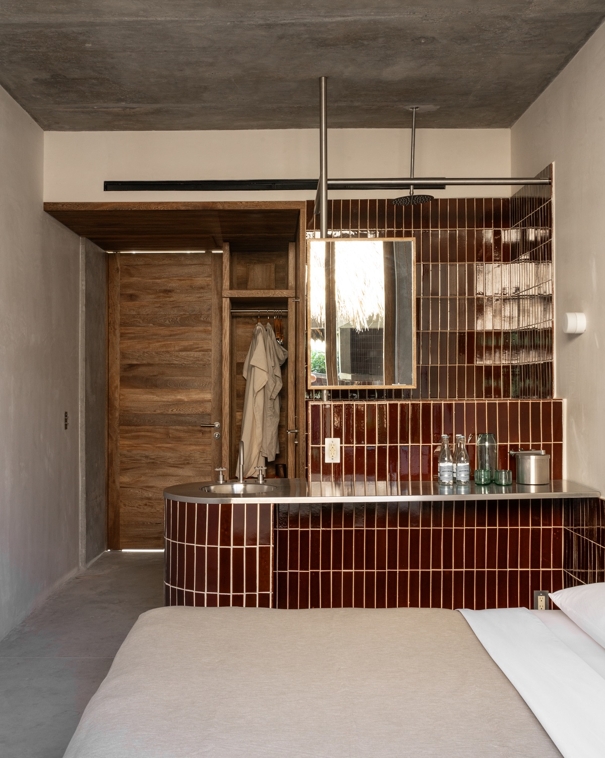This concept extends throughout the hotel’s 39 rooms, including eight suites, where areas for sleeping, bathing, and relaxing are interconnected with differing amounts of privacy created through the use of freestanding walls and curtains (toilets are in a separate cubicle). The recurrence of certain materials — such as handmade wine-coloured tiles by San Pedro Ceramics, which are used to line the shower, freestanding washbasin and mirror unit, and the bed’s headboard—create a lingering sense of integration. Each room is further accented by one-of-a-kind drawings by Mexico City–based artist Lucio Muniain.