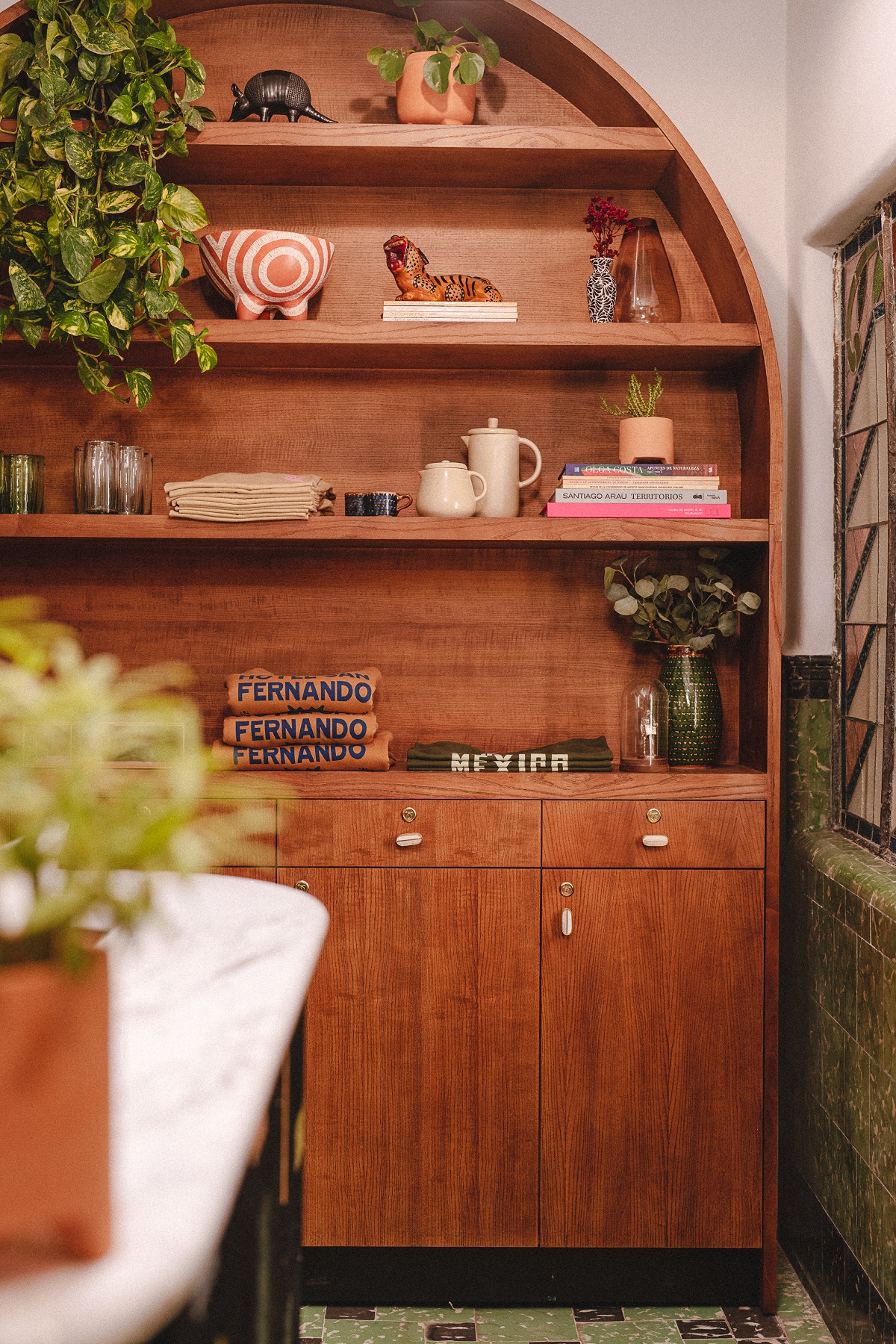 Guests can ease into the morning with complimentary breakfast on the rooftop with daily offerings such as fresh fruits, classic Pan Dulces and rotating specialities like Huevos Rancheros and Chilaquiles. In the evenings, guests are welcome to bring up snacks or a beverage from the downstairs lobby lounge. Accessible from the lobby through arched entryways in a rose-coloured lacquer, the lounge, which boasts limited outdoor seating, also makes for the perfect first or last stop of a storied evening. Stained-glass windows feature Art Deco details in bold hues of deep turquoise, dark emerald green, lavender and ochre, while soft green walls and a bar clad in clay tile with a marble top complement unique furniture that brightens the space, such as a chandelier by local female designer Rebeca Cors.