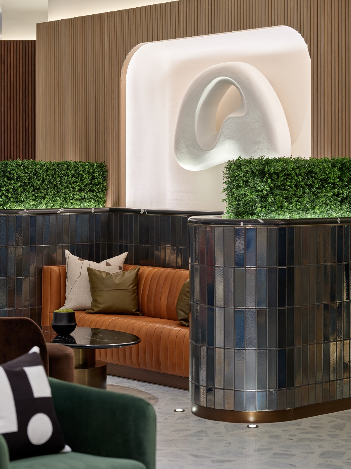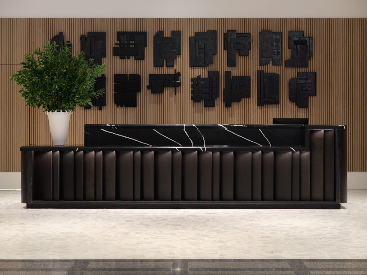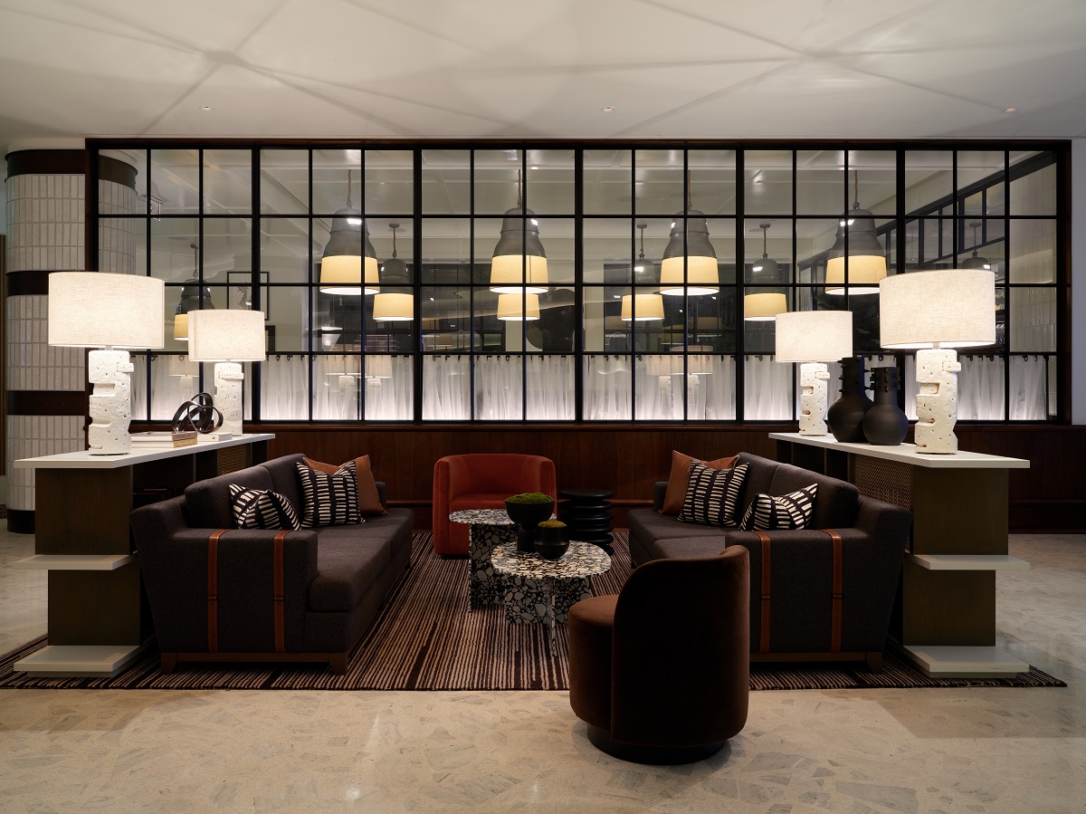 The hotels’ bold textures and patterns are a culmination of the ‘architectural grid’ narrative of the property, carrying a theme throughout with custom cross-hatch carpeting and terrazzo flooring. BHDM Design’s meticulous approach to reinventing this hotel resulted in an amalgamation of artistic and architectural components rooted in sustainability.