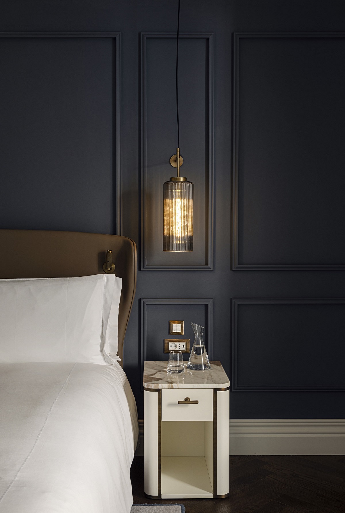 The guestrooms and suites, with a serene palette of colours, shun all sense of standardisation, underscoring Italian traditions and craftmanship—the bases for developing the two guest room schemes. Bespoke details and design emphasise the ancient city’s influence from brass handles reimagined to resemble Roman fluted columns to leather crafted headboards and fluted wall lamps, all original IA designs made by Italian artisans. Through geometries, patterns and hues, as well as a touch of unexpected modern style, the materials selection contrasts the richness of brass, the timber of flooring and the delicate tones of colour on walls and furniture.