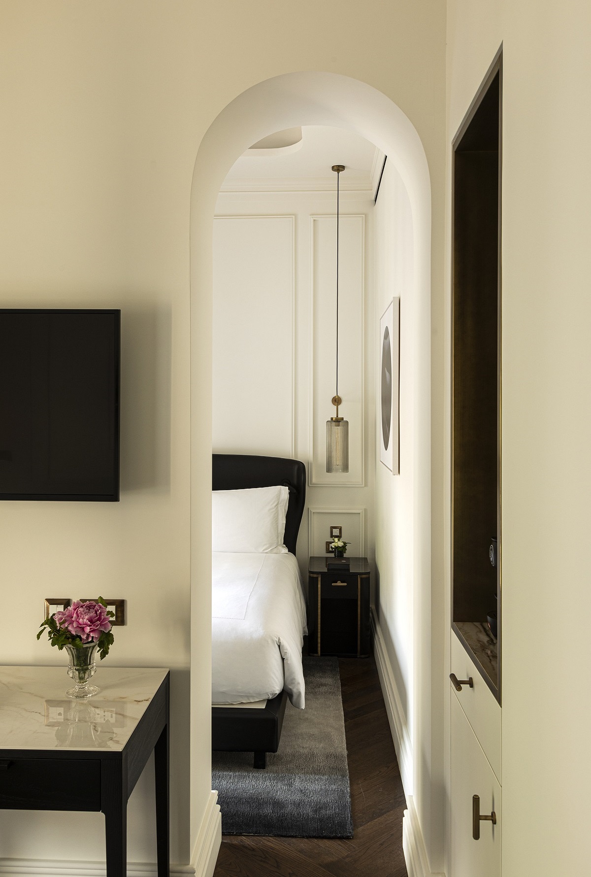 guestroom by IA Interior Architects with arched doorway leading from seating area into bedroom and floor to ceiling window