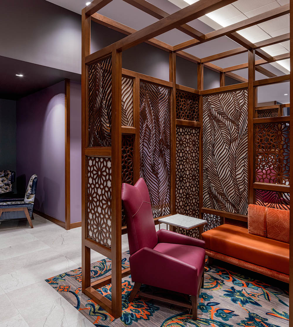 At the elevator lobby is a custom artwork featuring cubed versions of Florida maps mounted on a linen background and framed in a shadowbox frame. The elevators further provide an artful moment with bold black-and-white tiled flooring, blackened steel door frames, as well as a back-lit ceiling concept. Guestroom corridors have carpets with hidden tropical elements, such as bees and panthers. A graphic printed map of Tampa covers the walls familiarising guests with the city’s focal points. Hidden elements also surprise in the Hyatt House guestrooms. When lit, these rooms show a violet-hued wall with tone-on-tone patterns. Furnishings are all custom and feature two-colour finishes and extra trim to elevate their aesthetic. A kitchenette with decorative tiles accentuates the layout of these rooms.