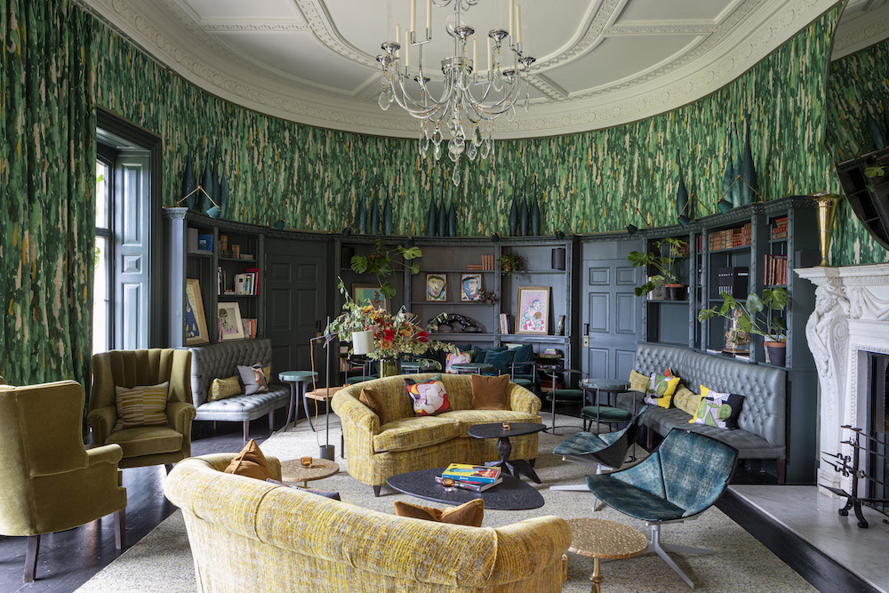 The Library completes the trio of rooms and invites the verdant garden surrounds of The Grove inside, with a scheme of tonal greens and earthy hues. A hand-painted, bespoke fabric covers the walls of the curved, oval space, complemented with dark panelling and contemporary artwork.